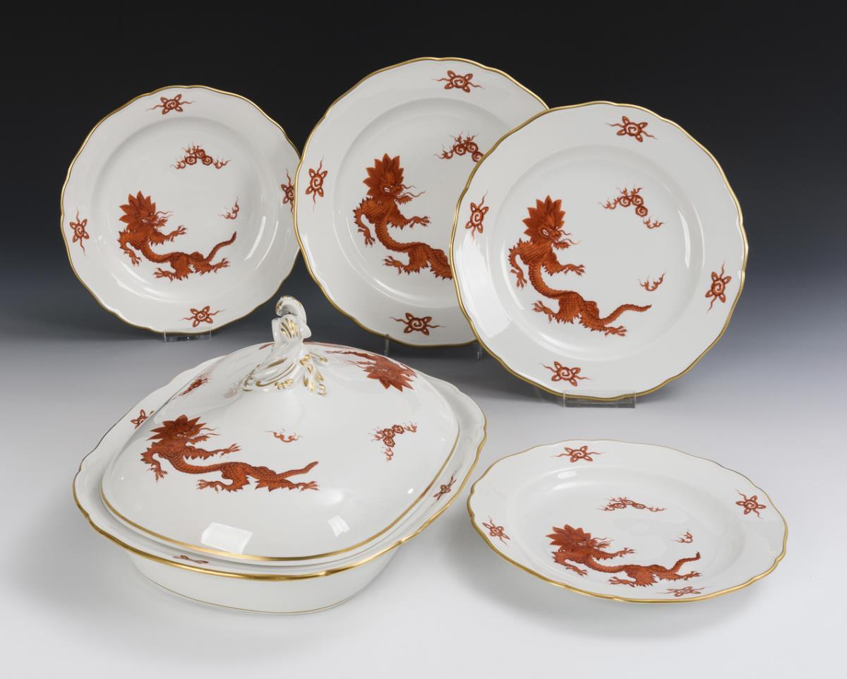 2+2 plates and 1 lidded bowl "Red Dragon". Meissen.