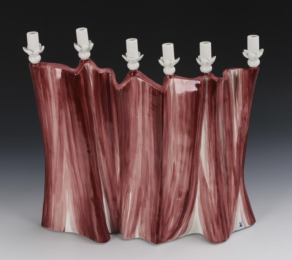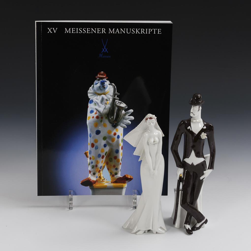 Theater curtain with six chandelier sleeves (35.5 x 38.5 cm) and the figures of Mackie and his bride Polly (H 21.5 and 19.5 cm). In addition, the booklet by Uwe Beyer "Peter Strang. Porzellanplastiker aus Leidenschaft", Meissener Manuskripte XV, Meissen 2001. 1 grommet of the curtain glued.