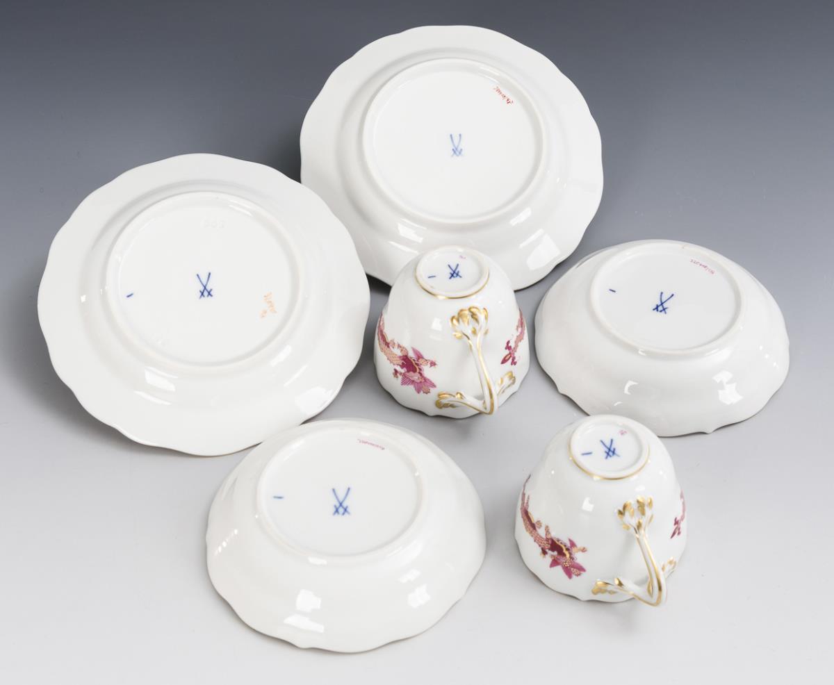 Purple painting, gold decoration. 2 demitasse cups (H 5 cm), 2 saucers (Ø 11 cm), 2 pastry plates (Ø 13.5 cm).
