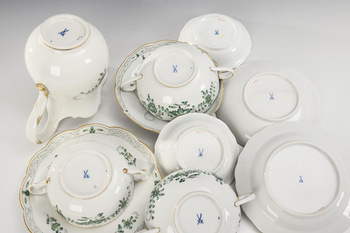 Predominantly "New cut-out" shape. Large milk jug (h 16.5 cm), 1 smooth soup cup with 1 saucer, 2 soup cups "Neuer Ausschnitt" with 2 saucers, 2 compote bowls (Ø 12.5 cm) and 1 plate (Ø 18 cm).