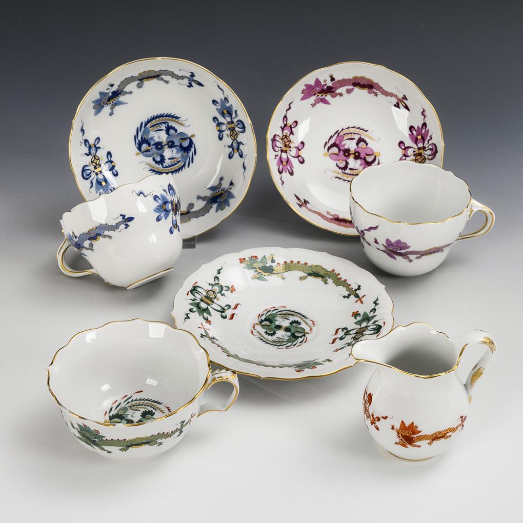 Different colored dragon painting (copper green, purple, coral, blue), gold decoration. 2 coffee cups (H 6.5 cm) with 2 saucers (Ø 14 cm), 1 teacup (H 5.5 cm) with saucer (Ø 15.5 cm), 1 milk jug (H 8.5 cm).