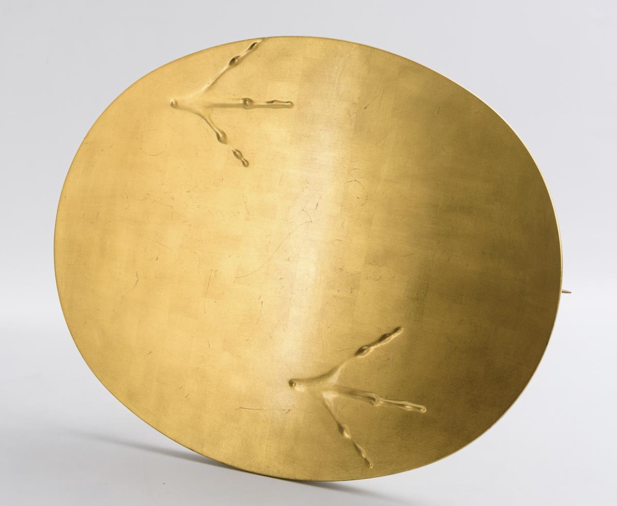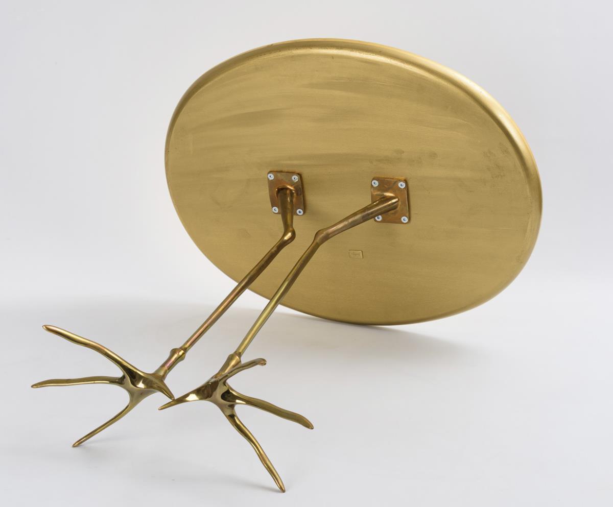 Oval design side table "Traccia (Spuren)" with gilded table top with bird footprints, on 2 long bird legs with claw feet, designed for the "Collezione Ultramobili" of the Simon company, in which surrealist objects were adapted to everyday use. Simon also realized designs by artists such as Man Ray, Sebastian Matta and René Magritte. Table top with slight scratches, legs with slight traces of corrosion.
