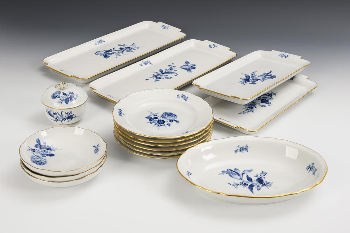 "New cut-out" shape. 2 + 2 king cake plates (L 29.5 and 39 cm), 6 plates (Ø 18 cm), 3 saucers, 1 oval bowl (L 25 cm) and 1 sugar bowl.