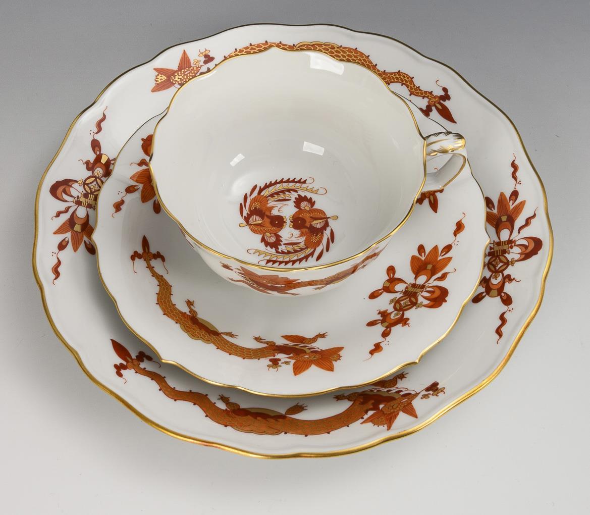Coral red painting, gold decoration. Teacup (H 5 cm), saucer (Ø 15.5 cm) and breakfast plate (Ø 20 cm).