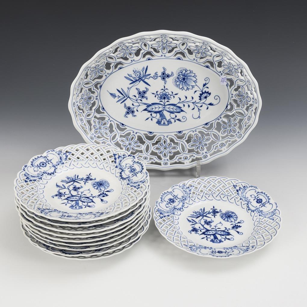 Onion pattern bread basket and 10 -breakout plates. Meissen.