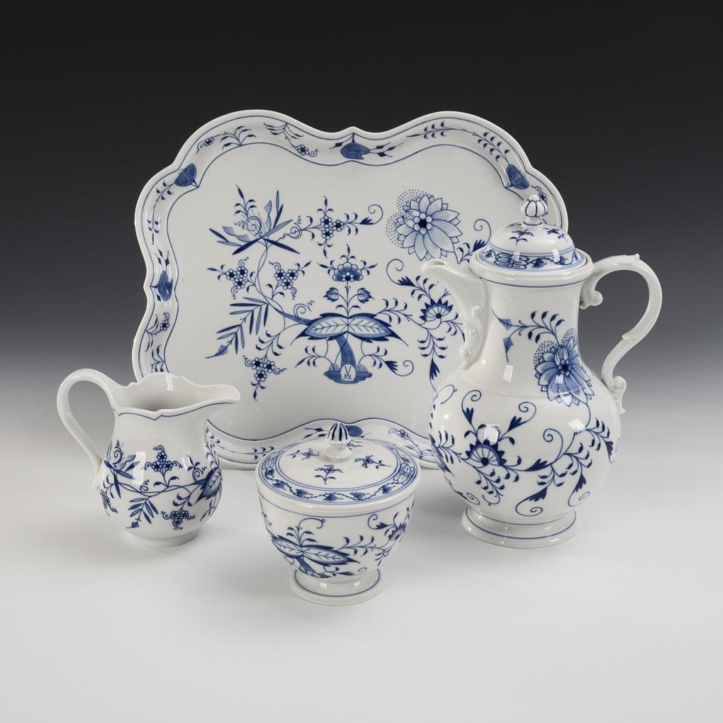 4 parts. Various shapes. Coffee pot (H 28 cm), milk jug, sugar bowl and tray (32.5 x 39 cm).