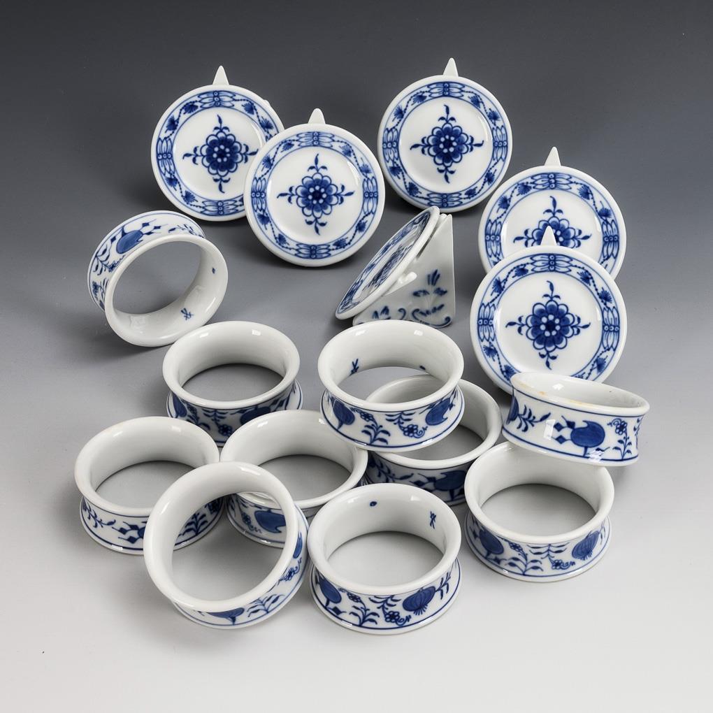10 onion pattern napkin rings and 6 place card holders. Meissen.