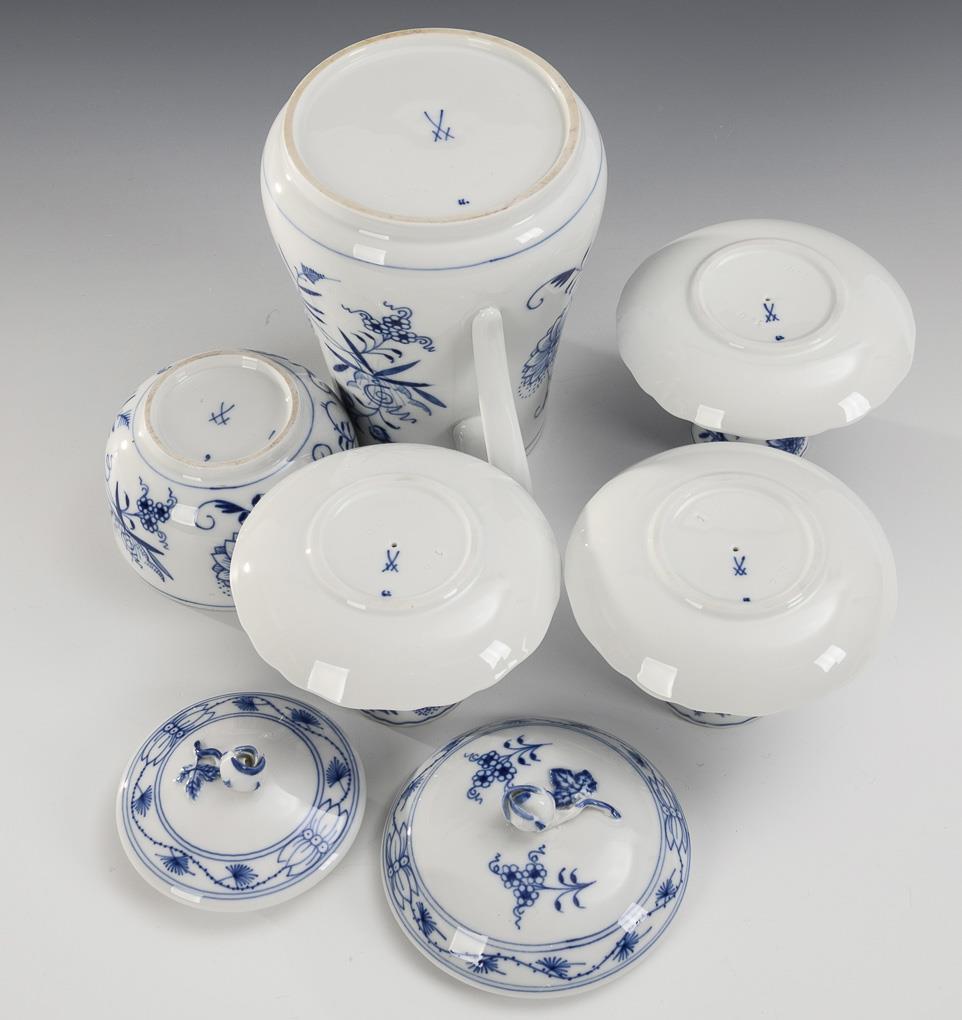 Onion pattern jug, 3 -egg cup and sugar bowl. Meissen.