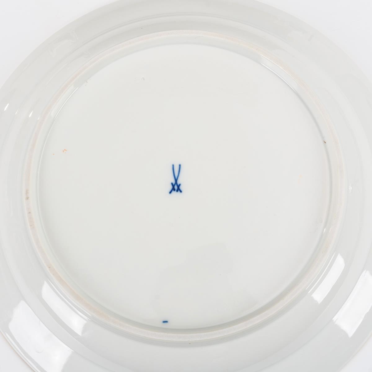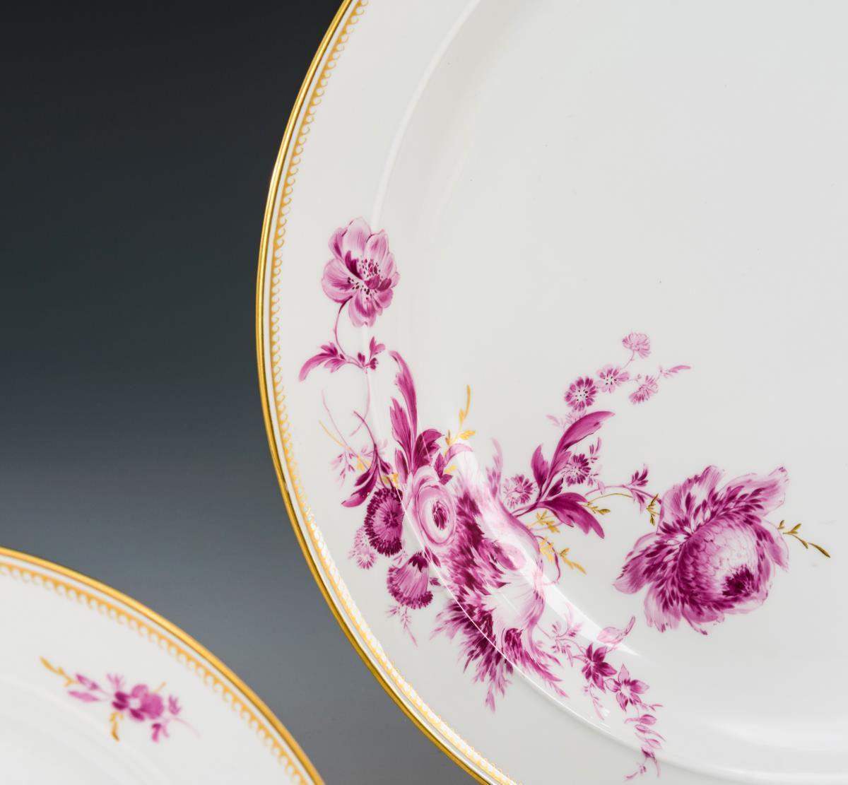 6 + 1 Teller mit Purpurmalerei, Meissen. Blauschwerter, 2. H. 20. Jh., 1. Wahl. Glatte Form mit purpurfarben gemalten Blumenbuketts und goldener Wellenkante. 6 Salatteller (Ý 21 cm) und 1 Gemüseteller (Ý 31,5 cm)..