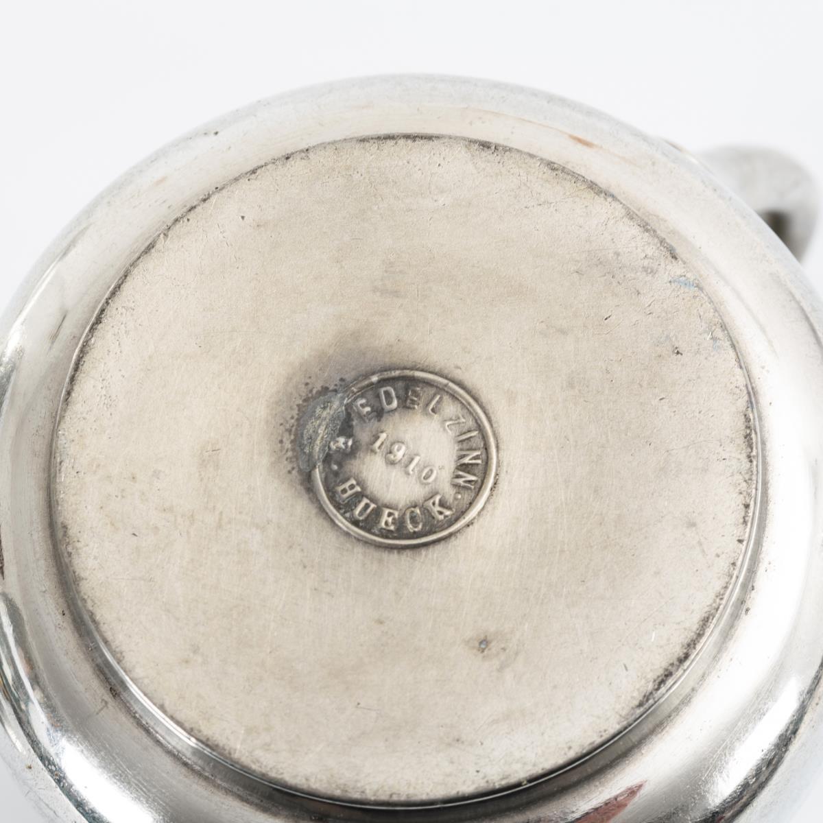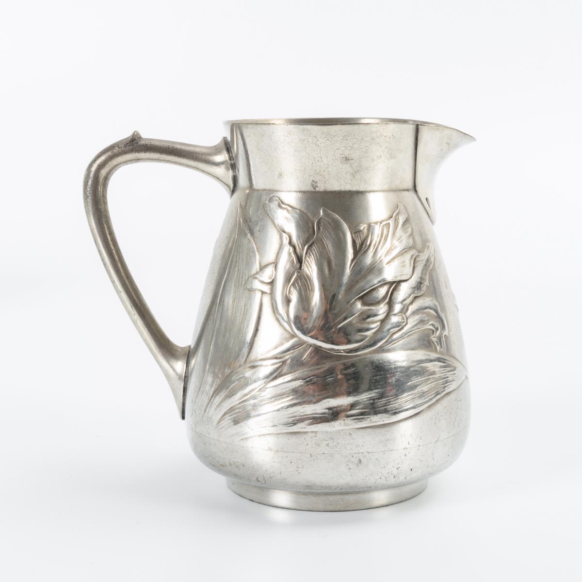 4x Jugendstil-Zinn: Milchkännchen und 3 Teller.