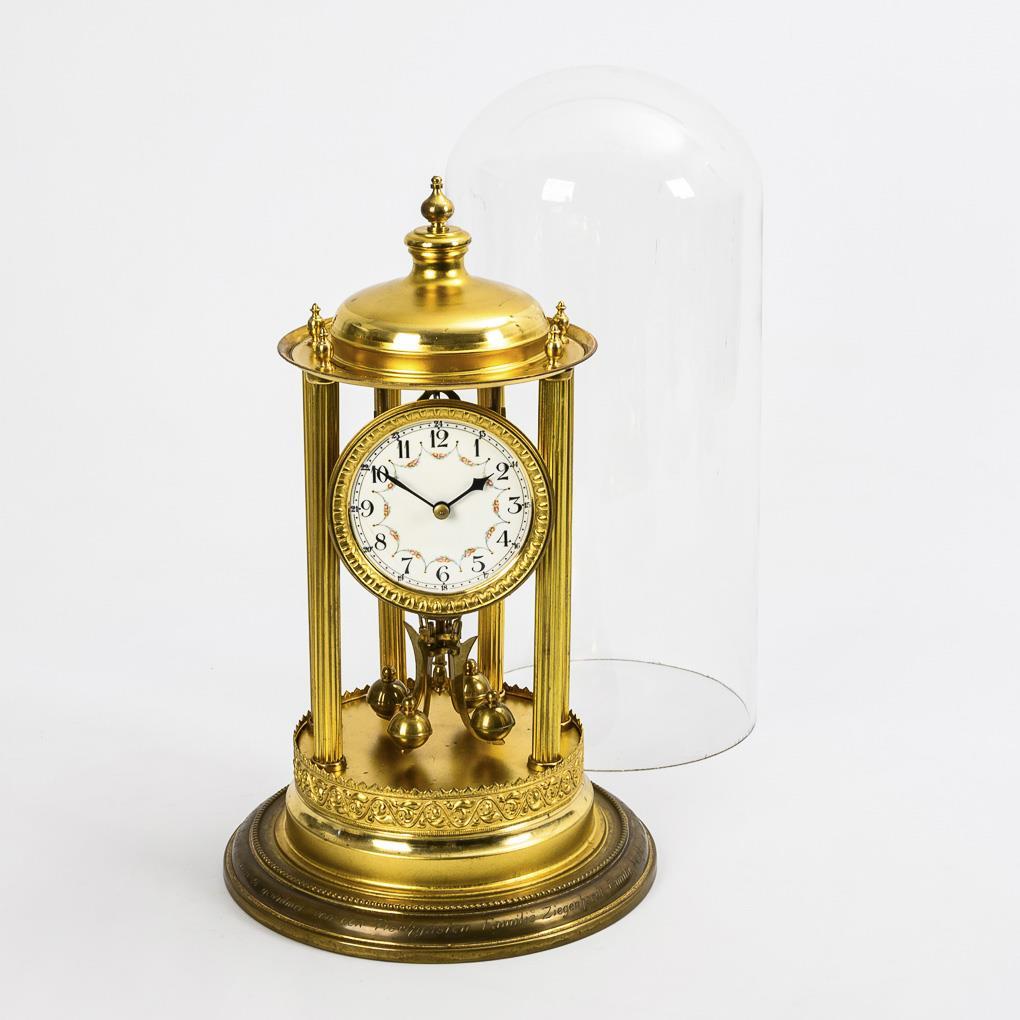 "Annual clock" in the form of a round temple with 6 fluted columns and a stepped podium with surrounding engraving "Dedicated to the silver wedding anniversary on 17.11.28 by the Ziegenhardt family, the Mühlmeier family and Otto Lehmann" . Signs of age and wear, bell with edge chips.
