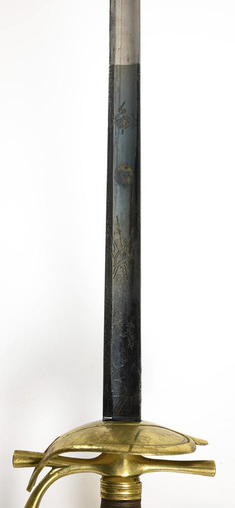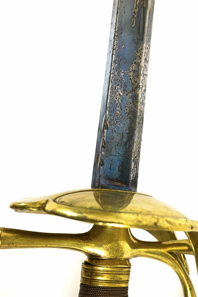 Also known as a cuirassier officer's interim sword. Straight single-edged blade, the first third blued and engraved with remnants of gilding, "I.G.B." Three deliberate notches near the grip. Heart-shaped, slightly curved guard plate with a shell end, straight quillons protruding through one end of the guard plate. Ball pommel with seal plate. Grip of fine wire winding, probably originally covered. Black leather scabbard with missing point socket.