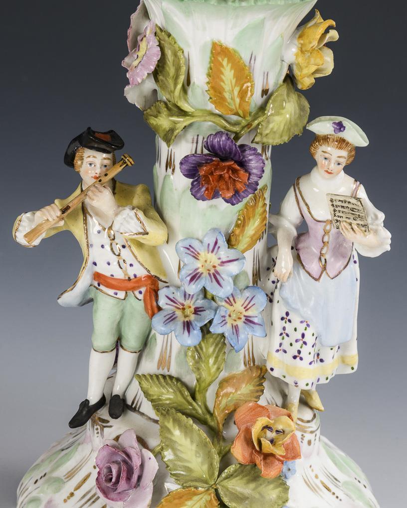 Four-pass flower-covered basket with flower painting, on a flower-covered tree trunk shaft with a pair of musicians standing on the trunk, base. Partially restored flowers and leaves, the lady's left hand and music sheet as well as the gentleman's hat, left hand and flute restored.
