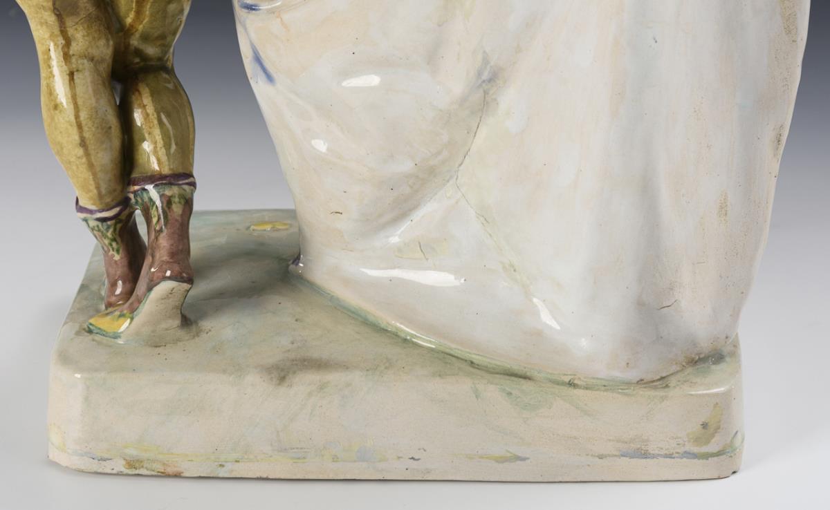 Majolica, painted in color and colorless lead glaze, partly decorated in gold. H 42 cm, with base H 44.5 cm.