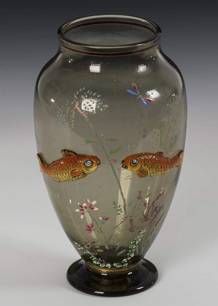 Baluster vase with two applied, enamel-painted fish on the front. 1 fish fin chipped.