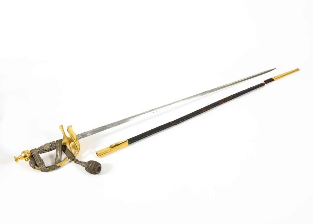 Also known as a cuirassier officer's interim sword. Straight double-edged blade with a central ridge. Heart-shaped, slightly curved guard plate with a shell end, straight quillons protruding through one end of the guard plate. One side hinged. Grip with silver-coloured wire winding and guard star.