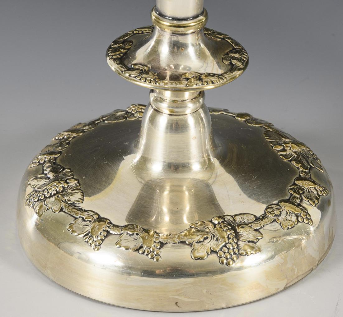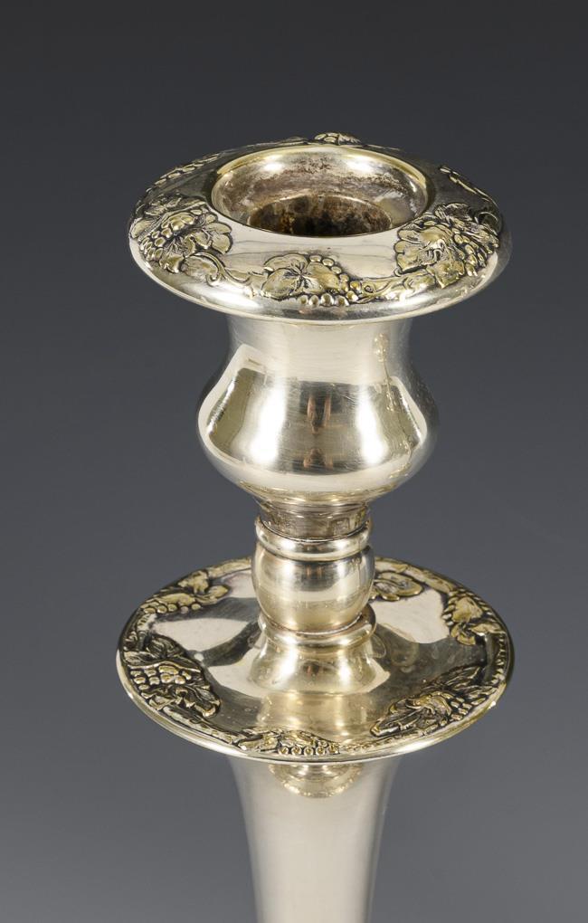 Pair of 1-light candlesticks with vine reliefs. Signs of wear, silver plating partially rubbed.