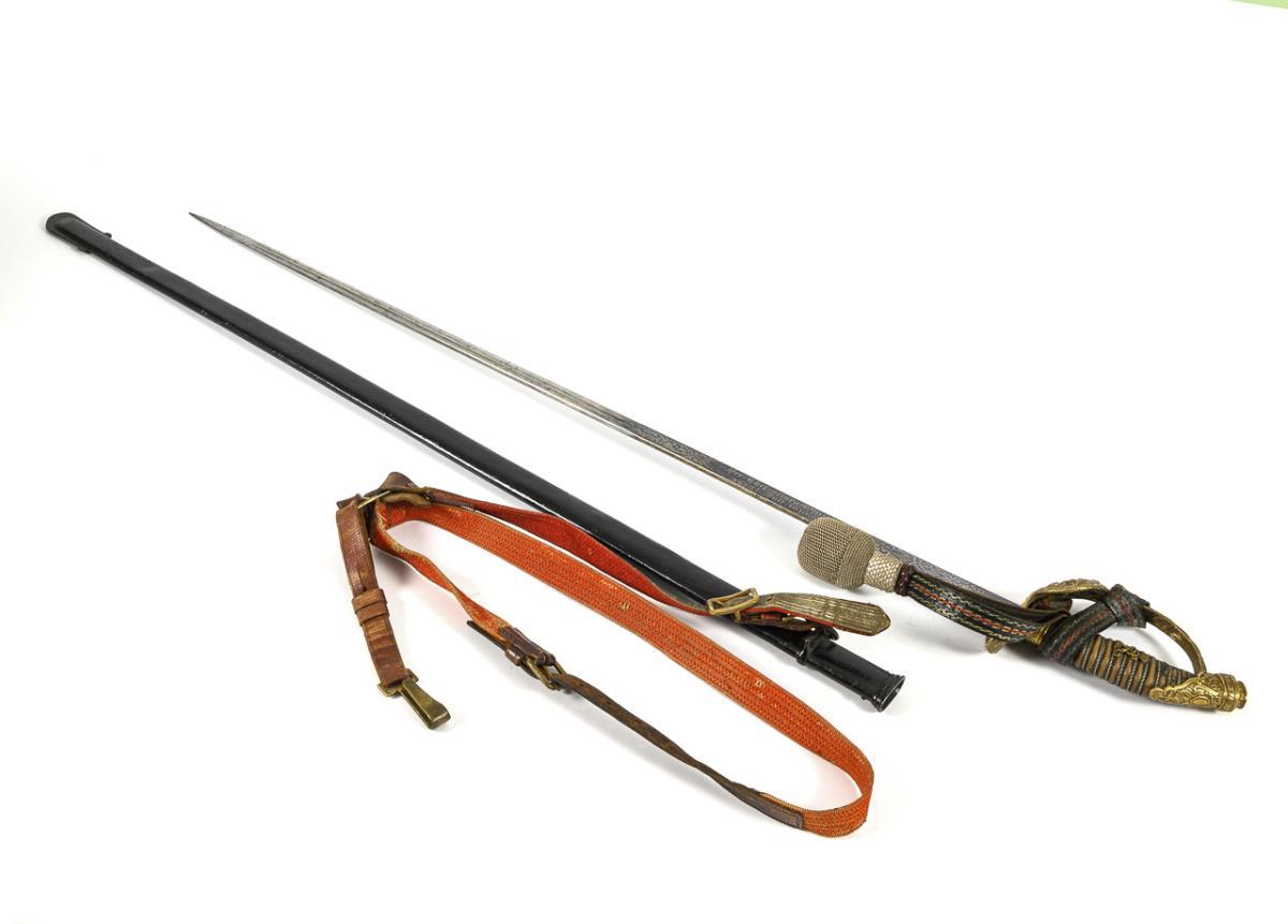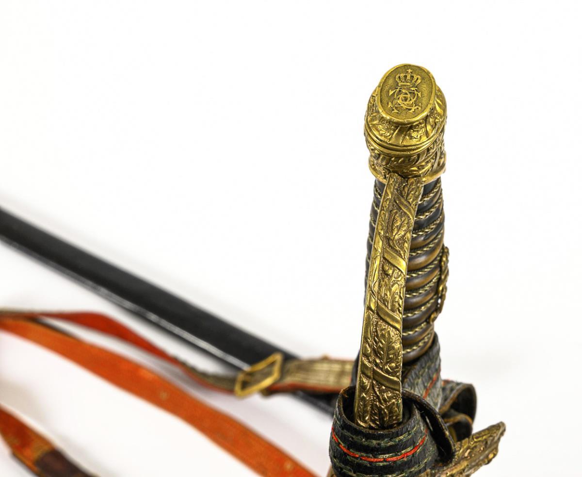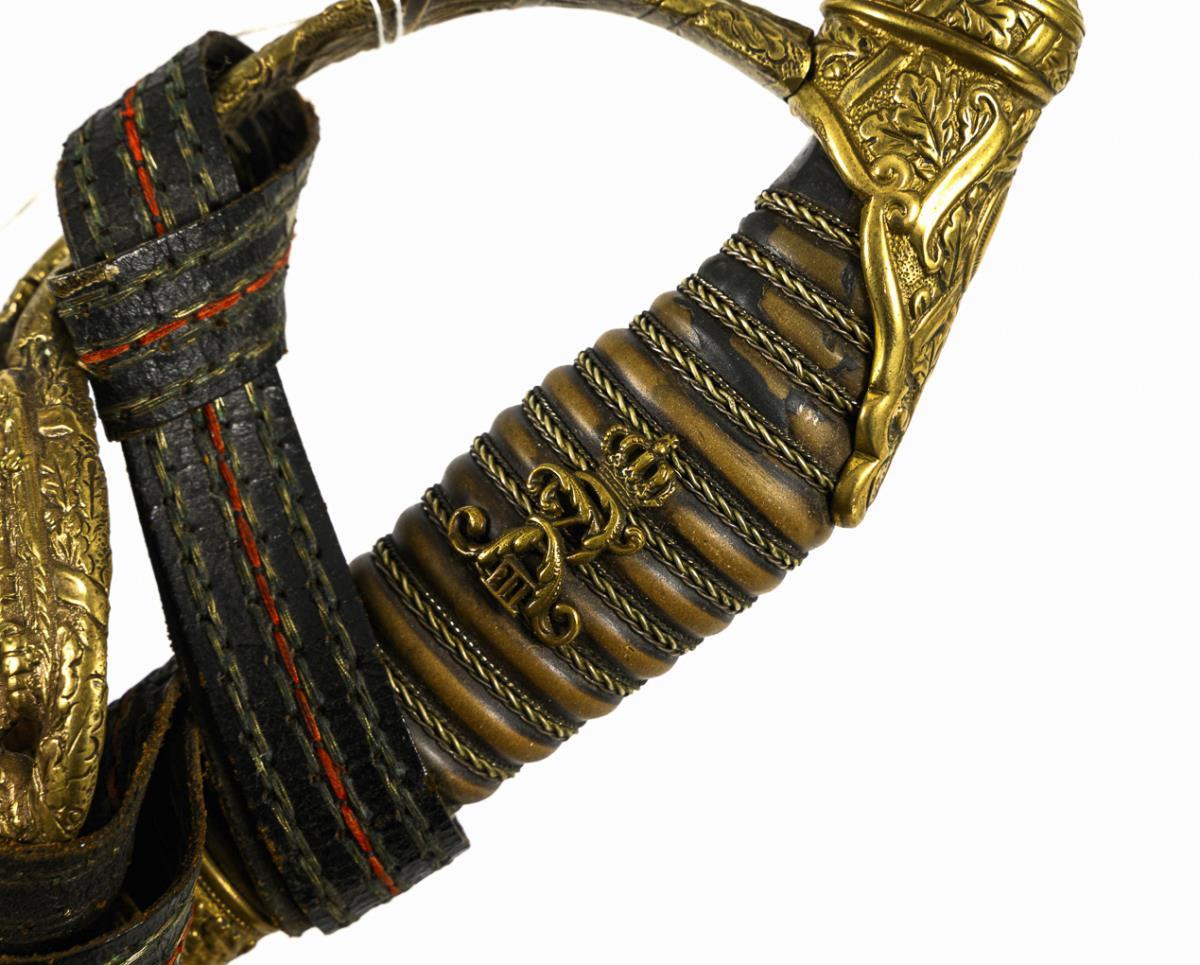 Straight, single-edged blade of Damascus steel, two narrow fullers in the front half only. Lower half with pronounced etched decoration and monogram "FR III" under crown, blade blued, remnants of gilding. "The chief to his officers July 24, 1910". Brass hilt with oak leaves in relief and a monogrammed eagle in the guard plate. Monogram on the flat pommel: "CCC" (Duchess Charlotte of Saxe-Meinigen, head of the regiment from 1897). Ribbed grip with triple wire winding (heavily worn), the ruler's monogram applied once more. Comes with a lanyard and carrying strap. Black metal scabbard with a suspension ring. / Grenadier Regiment King Frederick III, 2nd Silesian No. 11, Breslau 1801.
