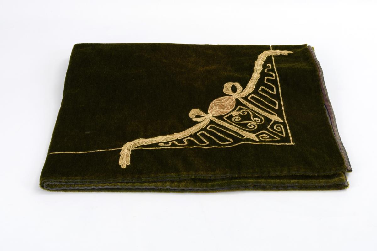 Art Nouveau plush decorative blanket with gold-colored embroidery, circa 1910.