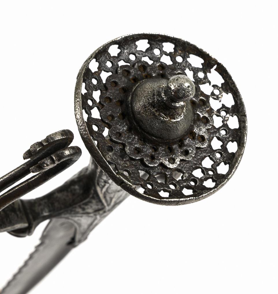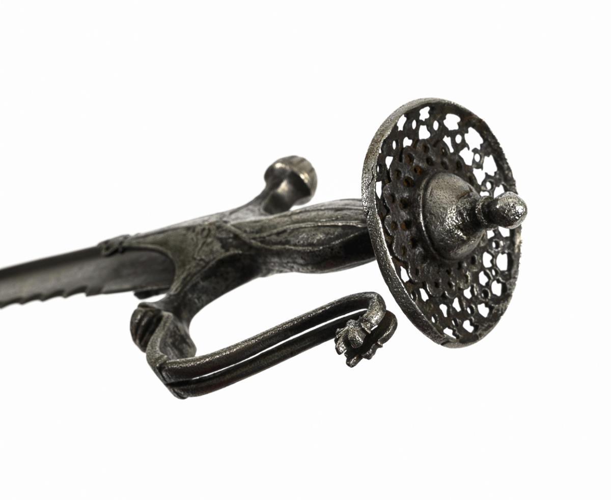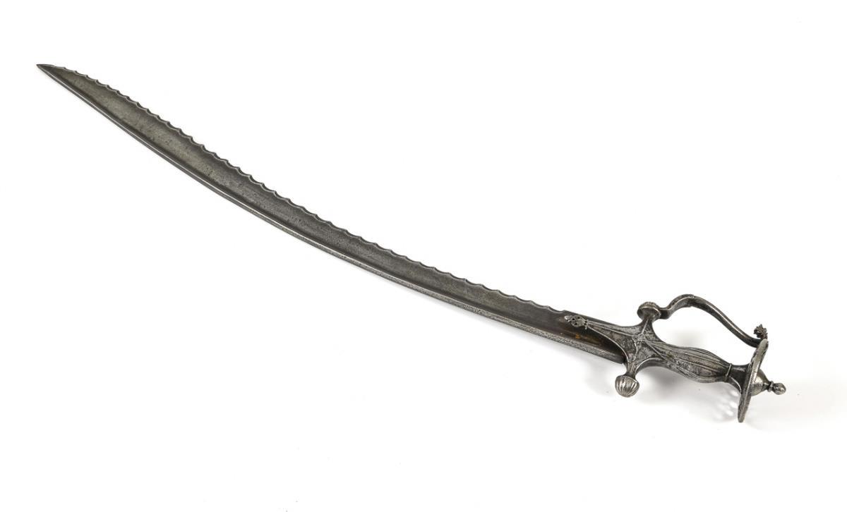 Also called talwar. Curved blade with reinforced spine and serrated inner curve. Iron grip with long, decorated central iron, knuckle bow and disk pommel.