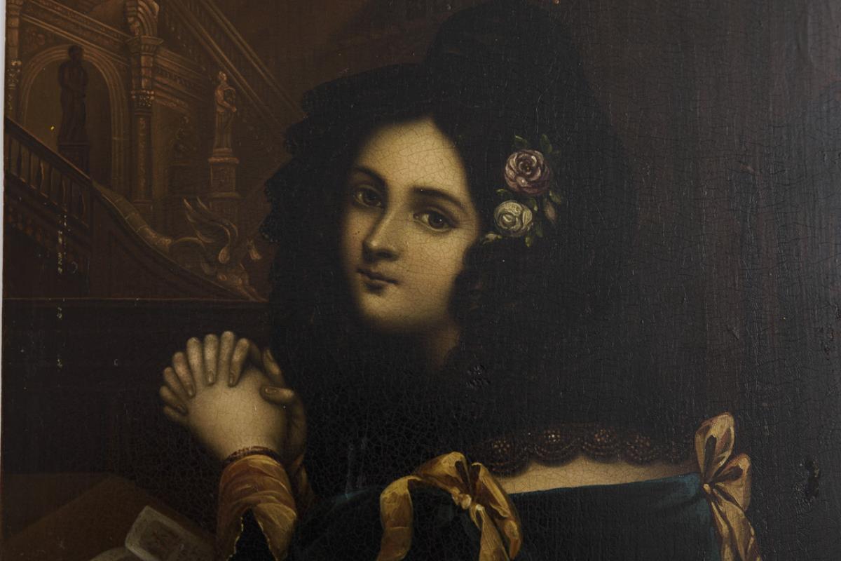 A young woman in Biedermeier costume praying in the church in front of an open book, looking over her shoulder at the viewer. After the painting "Rosina en prière" by Guillaume Lepaulle / Frame with decorative reliefs. Few paint chips, minimal craquelure / Frame with minor traces of age/use.