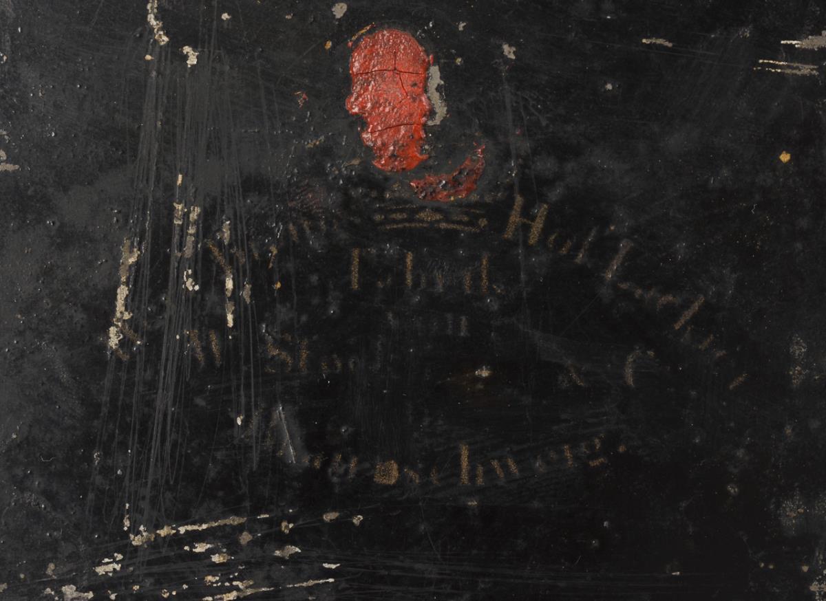 Painted tinplate, verso painted black / wood, gold-bronzed stucco. Image 15 x 11.5 cm. / Frame: Clear dimensions 15.5 x 13 cm, rebate dimensions 18 x 15 cm, overall dimensions 27 x 25 cm.