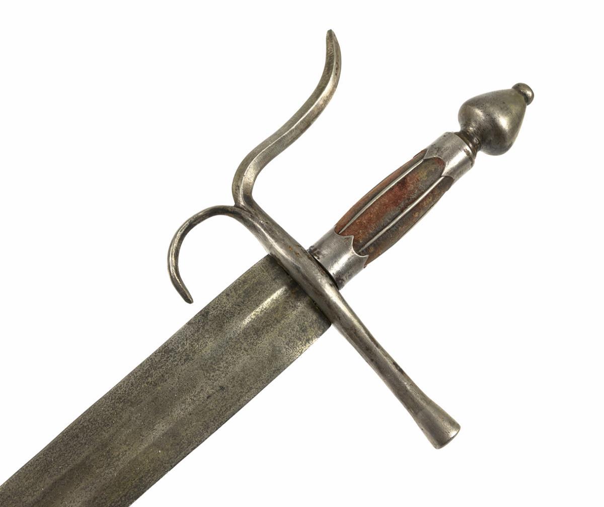 Broad, straight double-edged blade with a fuller in the midline. Massive grip with remnants of a velvet cover. In form a 16th century sword.