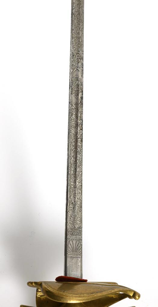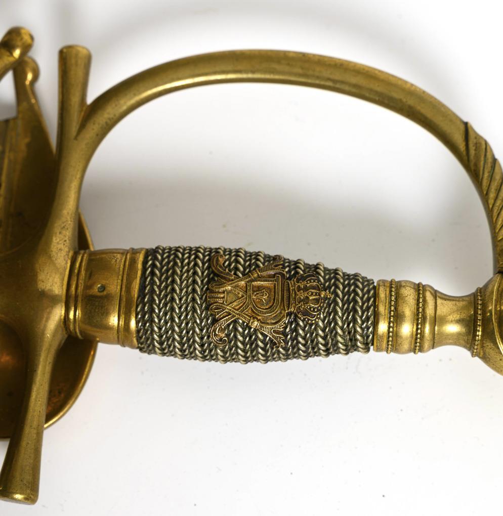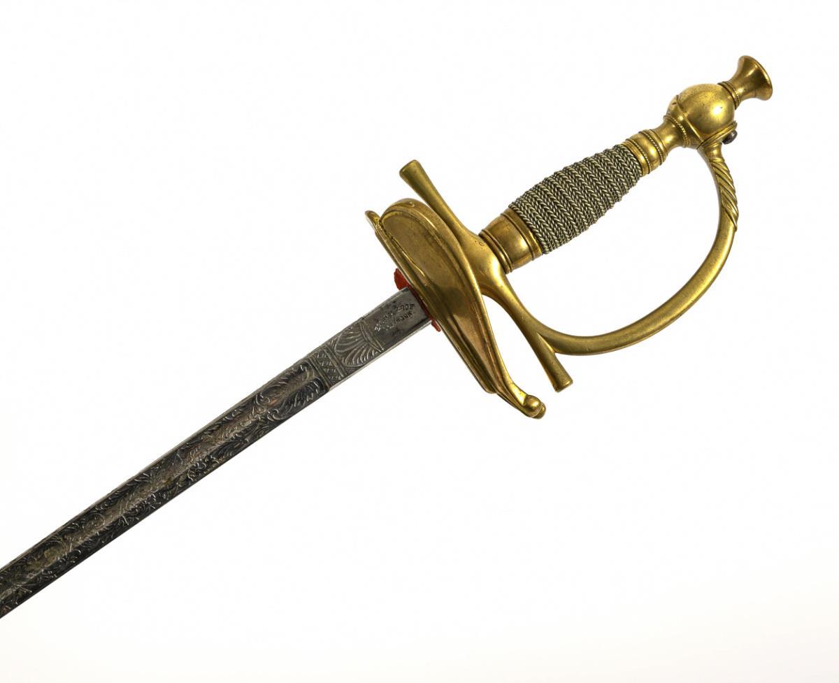 Straight single-edged "Eisenhauer" blade with relatively wide fuller. Two thirds of the blade richly decorated, including the imperial eagle. Brass hilt with a heart-shaped guard plate, one side hinged. Ball pommel with large decorative screw. Silver-colored, cast 'grip winding' with applied monogram. Dark brown leather scabbard with hook.