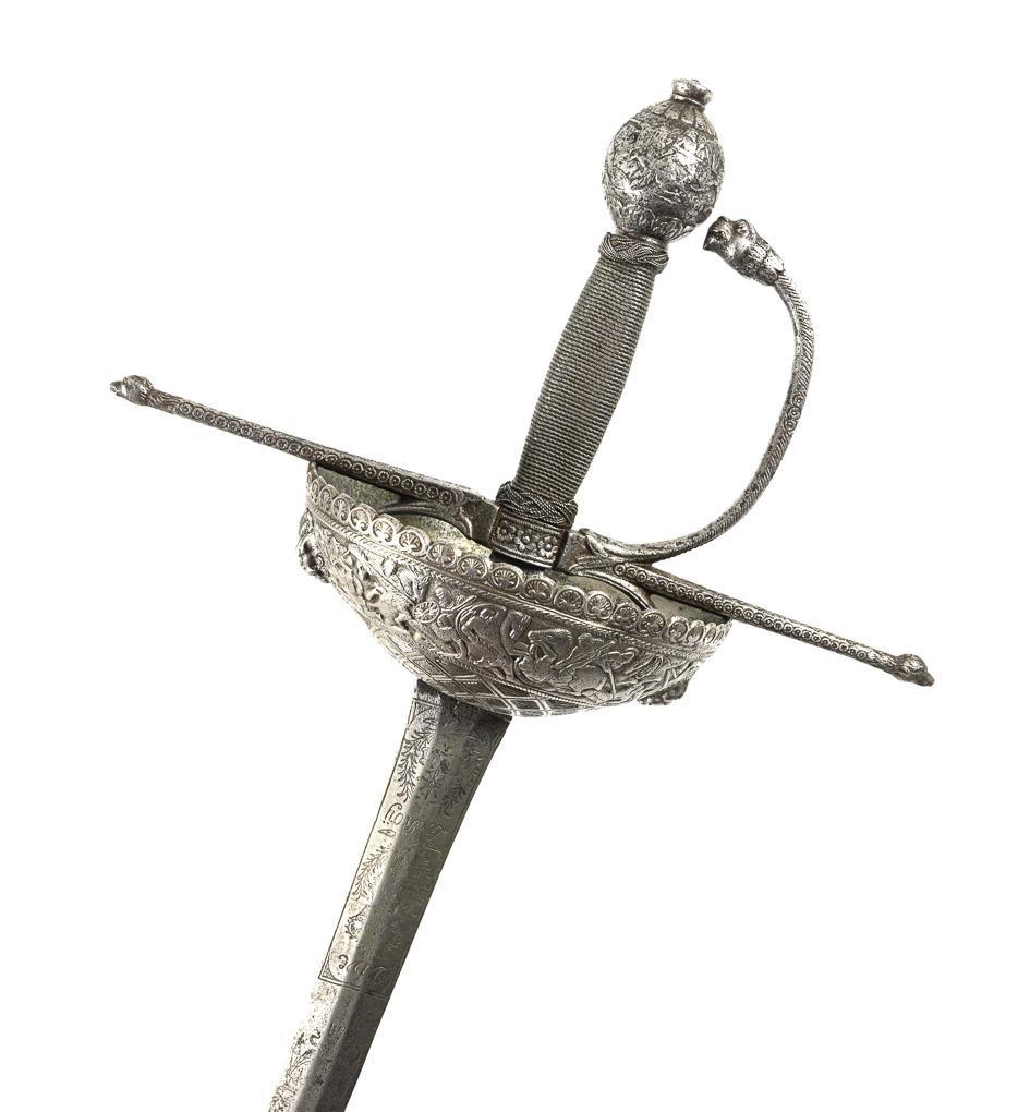 Large sword with a straight, double-edged blade of hexagonal cross-section. Engraved with two figures in a cartouche and the blade inscription: "Tournay Tournay" and with a wreathed crown and two drums and the inscription: "Vive le Roy". High quality blade. Basket with a revolving relief of a battle scene repeated on the ball pommel, quillons and guard also decorated. Basket with traces of repair on the inside.