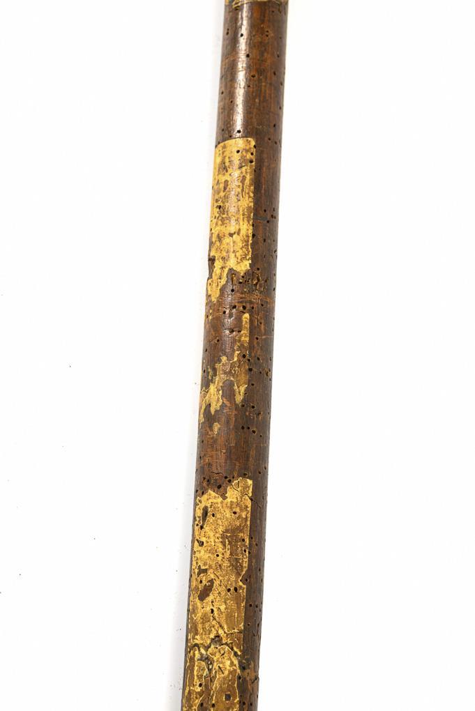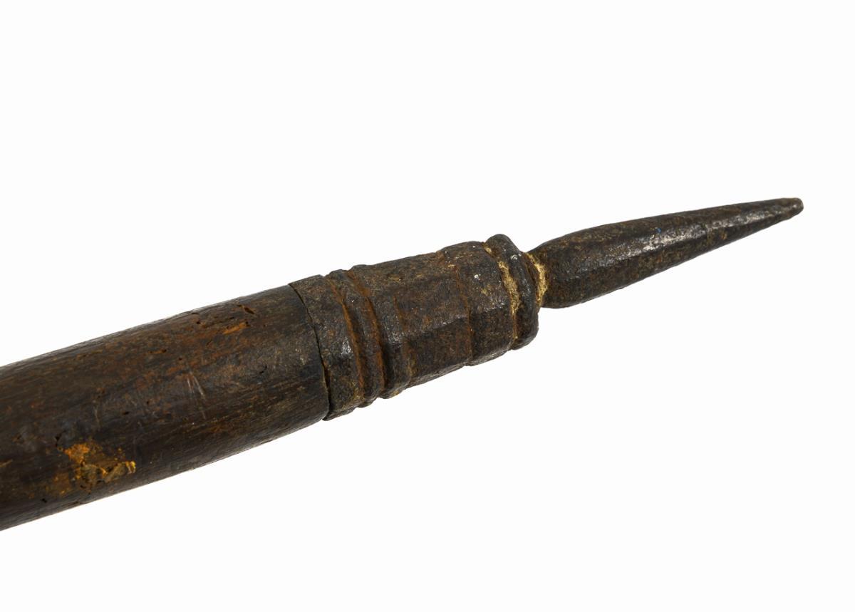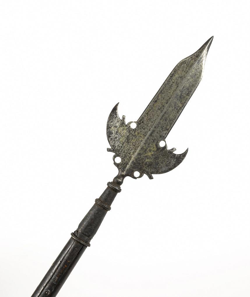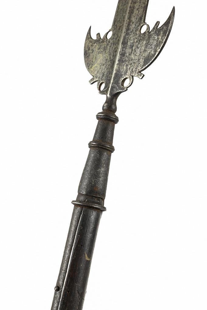 Double-edged blade with elaborate point. Round, jointed socket and two straps for attachment to the shaft. Foot with metal tip. Shaft with traces of anobia infestation and old paper labels, probably once used.