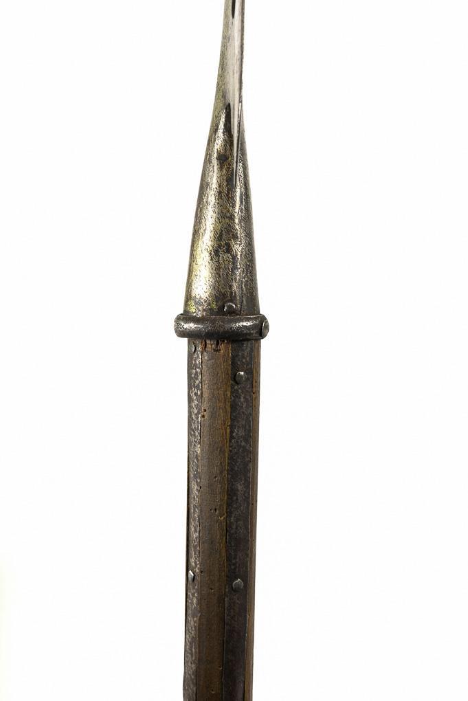 Double-edged blade with central ridge and irregular sides. Shaft attachment with socket (grommet). The four tang bands are apparently not connected to the blade, seam concealed by a ring. Slight corrosion pitting, two chips on the blade. Wooden shaft with traces of anobia infestation, broken off at the bottom.