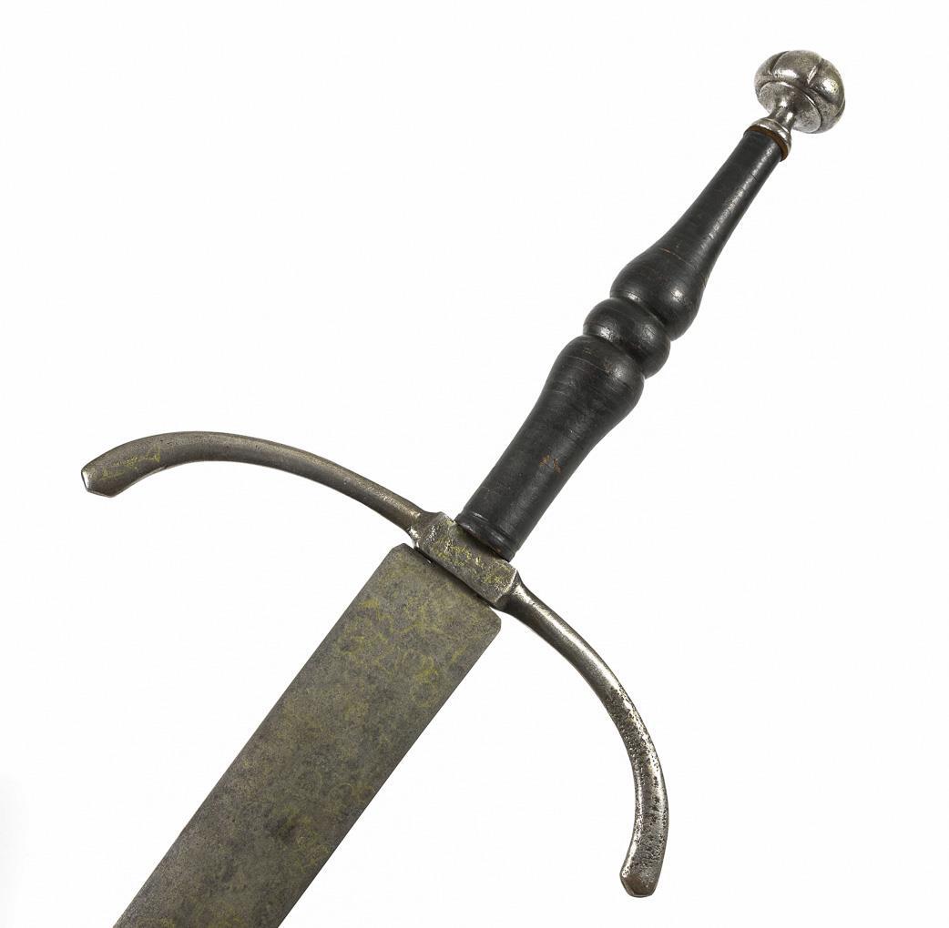 Straight, double-edged blade, spring-loaded. Wooden grip with fine leather wrapping and iron pommel. Stitch ring loose.