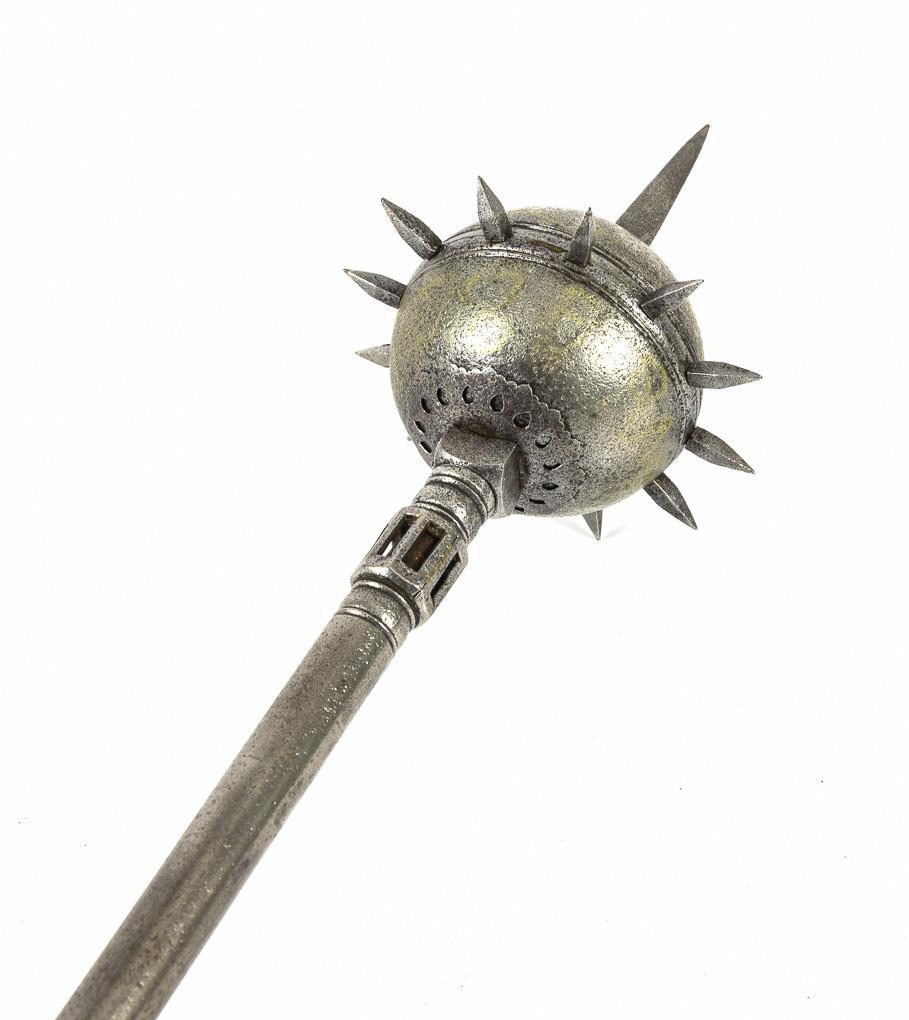 Weapon with pointed ball and stock with nodi and ball pommel. Shaft and balls with inconspicuous central seam.