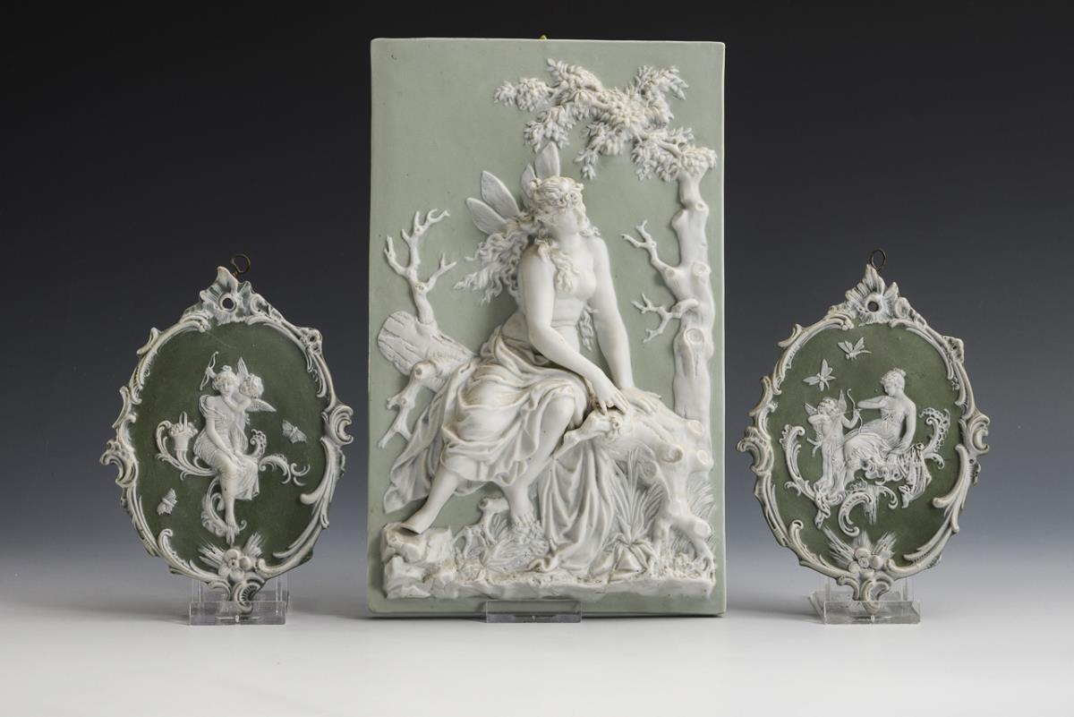 Green-coloured bisque, semi-plastic relief scenes in white in the style of pâte-sur-pâte.