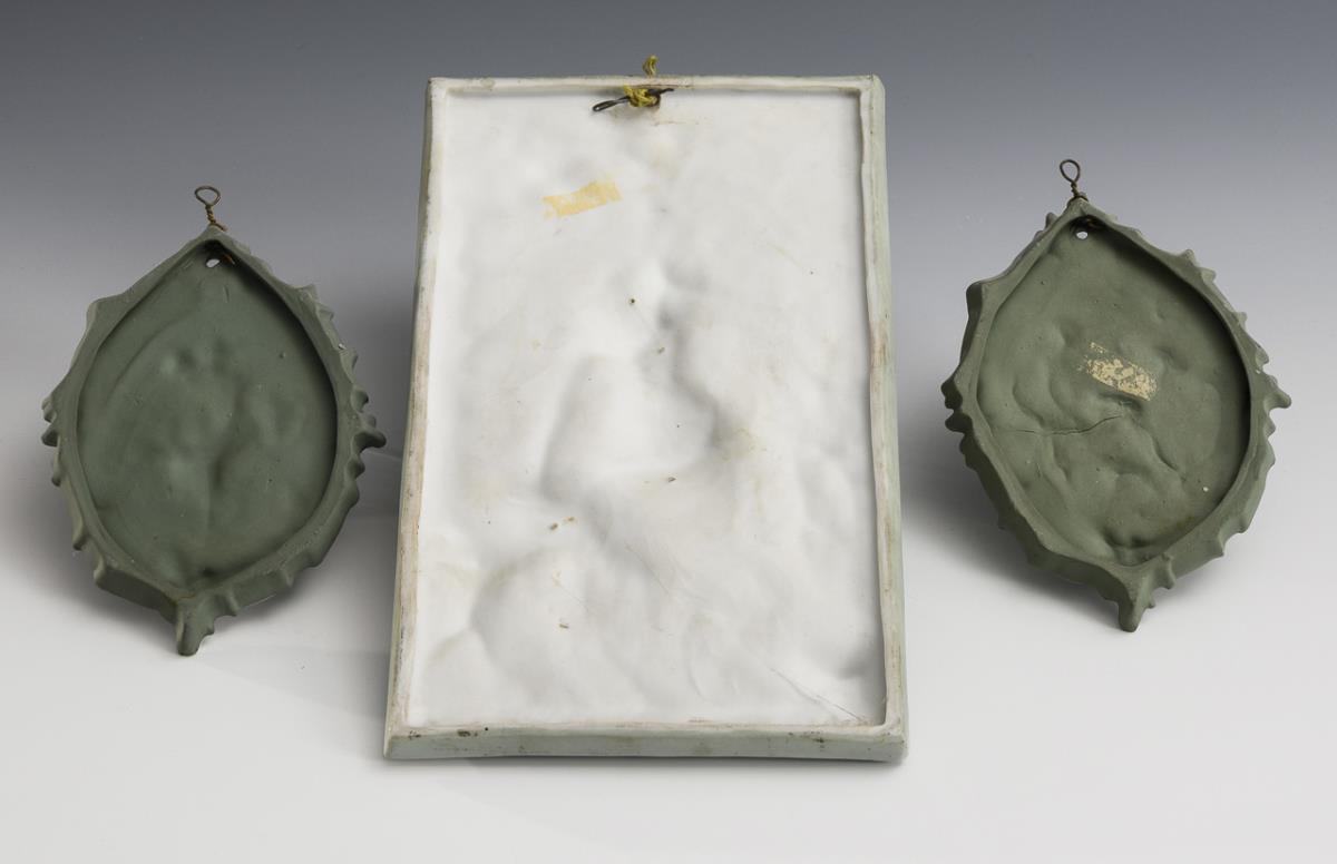 1x rectangular plate with the depiction of an elf under a tree (25.5 x 15.5 cm). / 2x oval plaques with depiction of Venus (L 15.5 cm). Rectangular plate: 1 branch bumped, 1 plaque verso with fire crack.