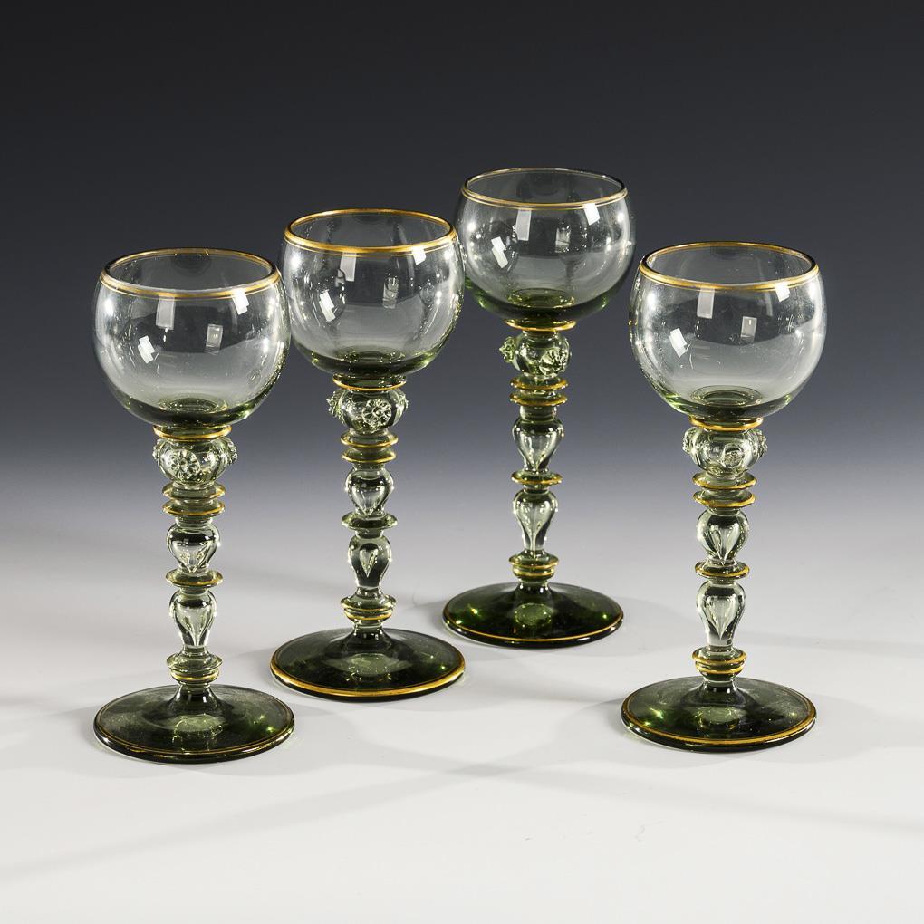 4 Romans in olive green glass with berry scales on the multi-jointed stem and gold decoration (h 16 cm). / 1x made of dark green glass with wiggle band, berry scales and engraved grapevines (h 18.5 cm). / 1x made of spiral-optically mold-blown olive green glass (H 17 cm). / 1x made of green glass with berry scales on the hollow stem, polychrome floral painting on the bowl and gold decoration (H 14.5 cm). Gold slightly rubbed,1x with foot bump.