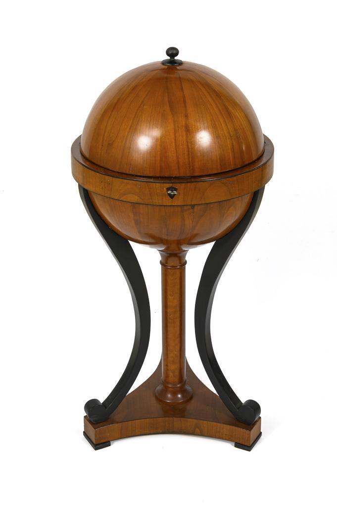 Elegant spherical sewing table on a central column support and 3 voluted, ebonized decorative struts on a trefoil-shaped base; half-sided retractable spherical flap; inside architecturally structured mirror and 3 compartments with lid, in the middle a removable insert as access to the lower storage space lined with floral decoration with a small secret compartment. Signs of age/use, veneer with small defects.
