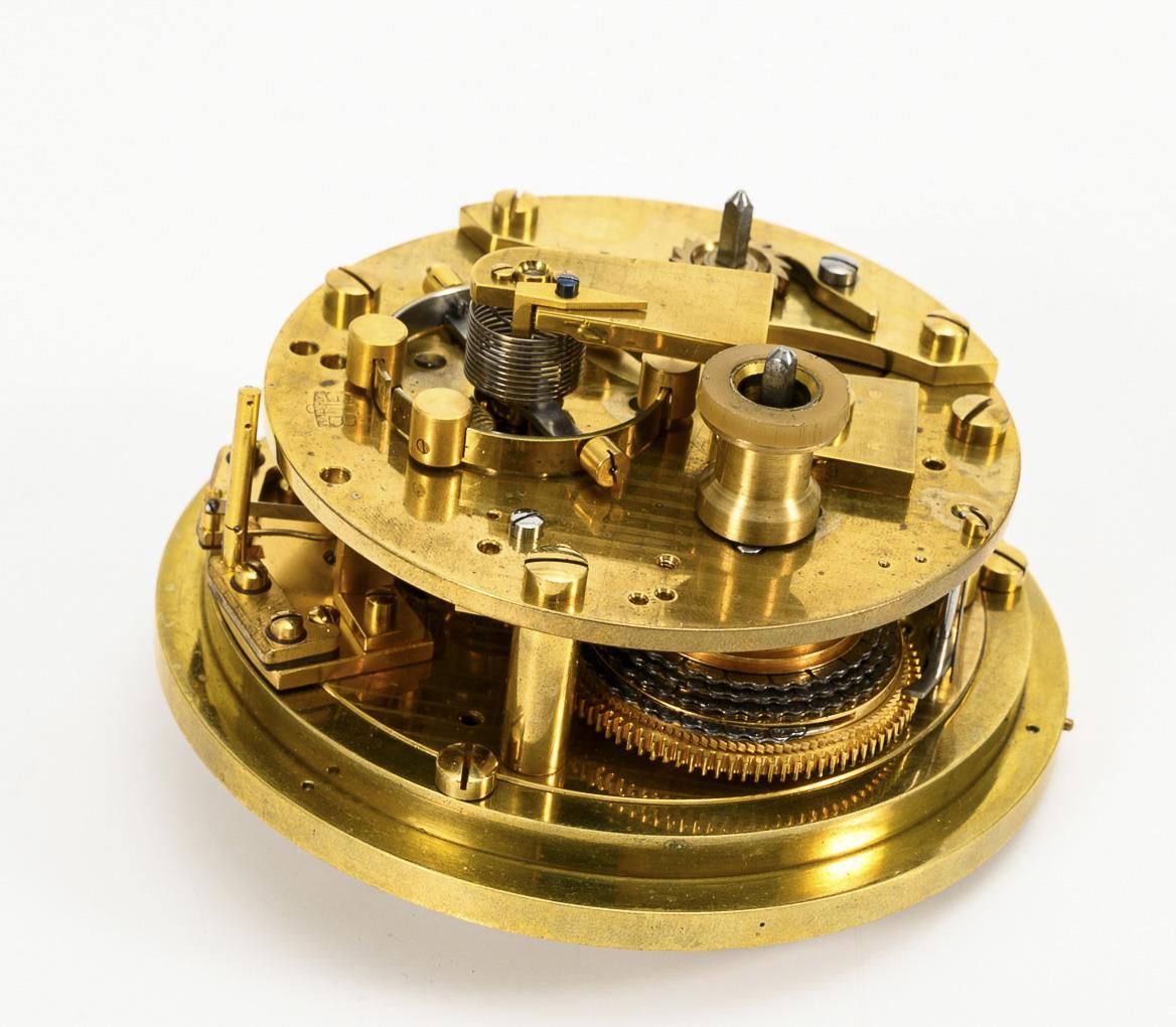 Each marked 4-pillar marine chronometer GUB caliber 100 with chain and fusee, keywind. Functional in short time test. Each with a silver-plated dial marked "Glashütte" with Roman numerals, minute ring, small second, UP/DOWN indication and brass leaf hands.