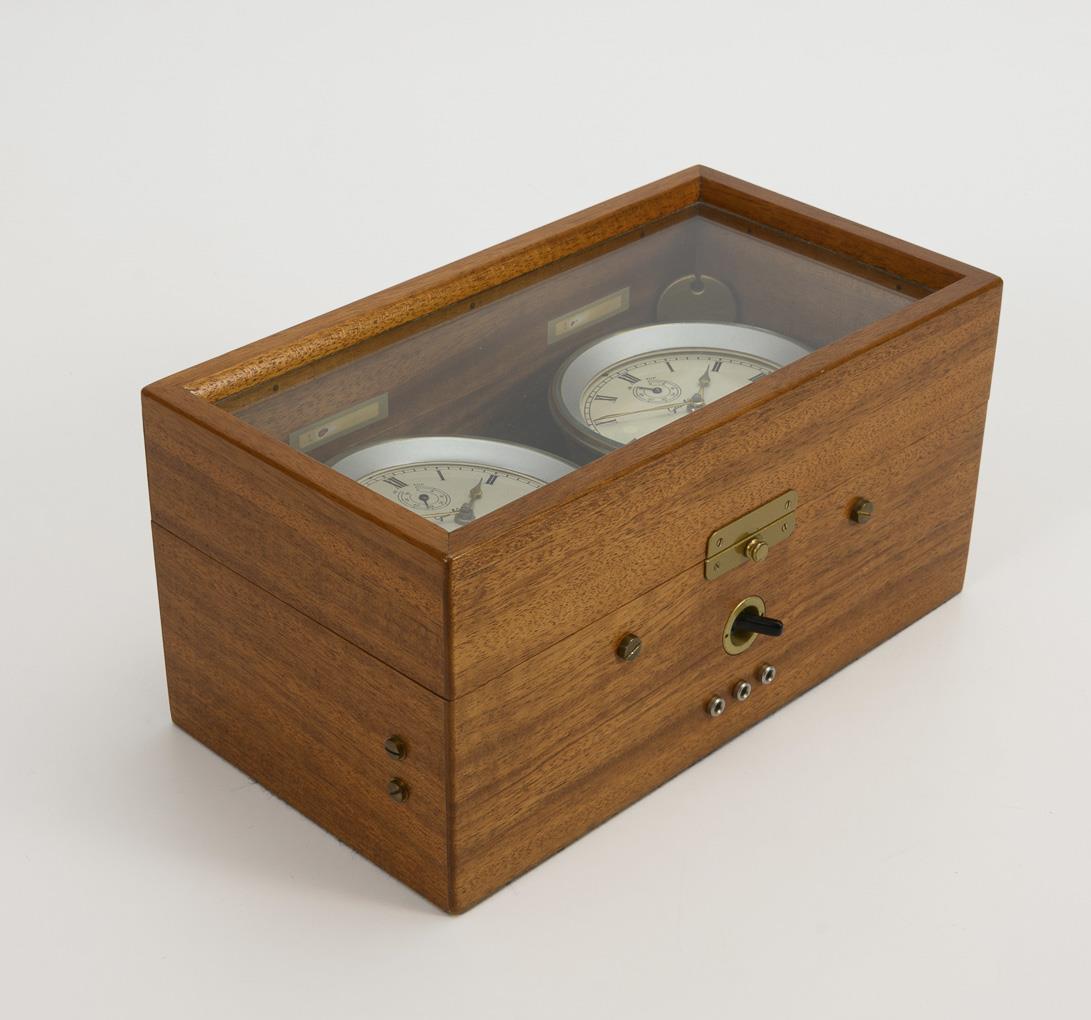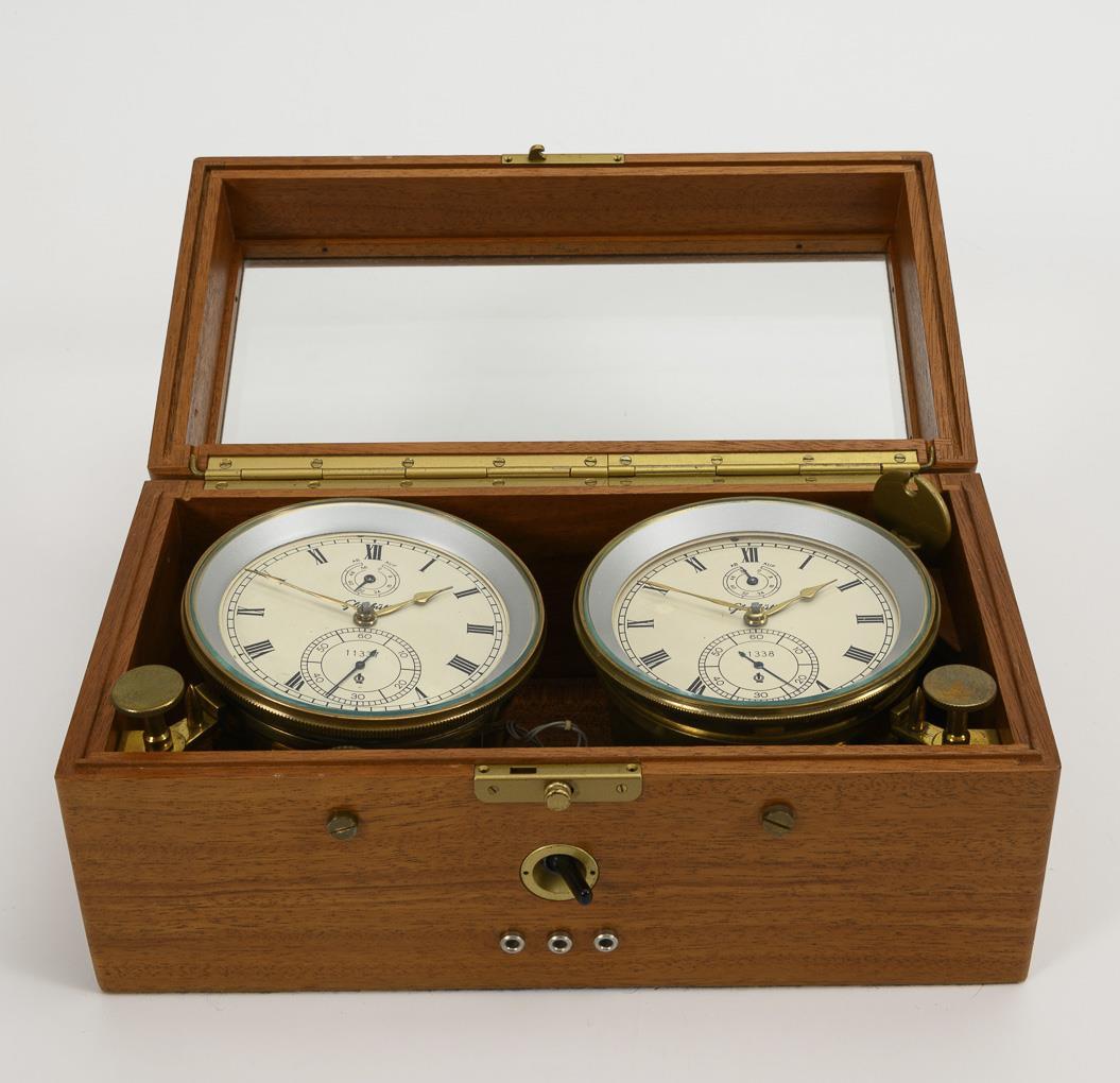 2 independent marine chronometers in mahogany wooden case with glazed hinged lid, each with locking mechanism. Additional electrical device with bakelite toggle switch. Minimal signs of age and use.
