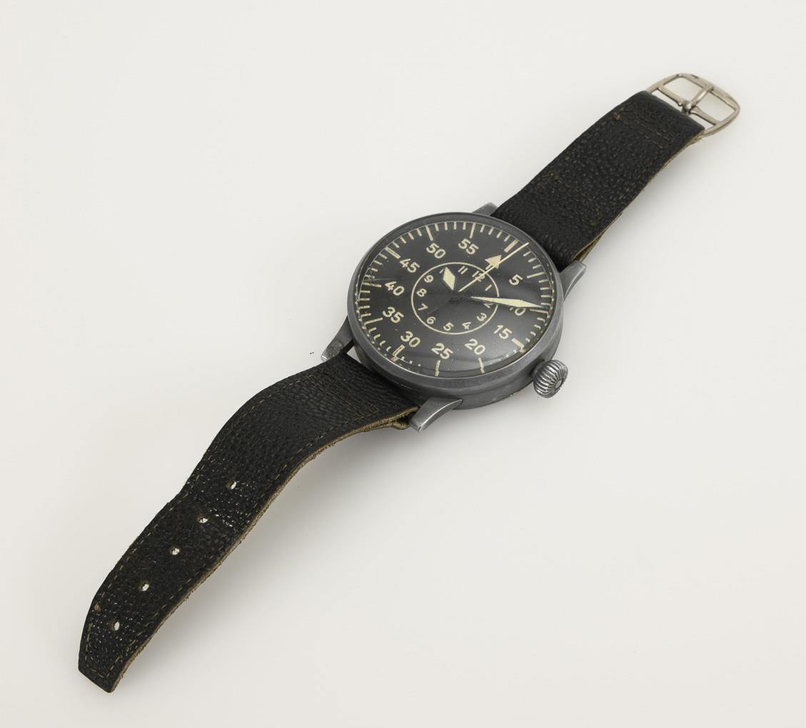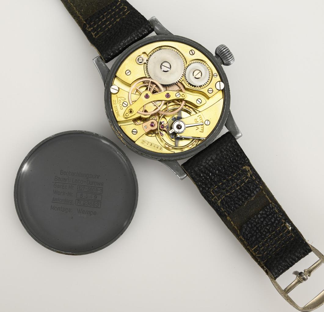 Luftwaffe observation watch with raw movement by Laco-Durowe. Completed as a complete pilot's wristwatch by Wempe, Hamburg. Round, gray matted metal case on a black leather strap with pin buckle. Slight signs of age and wear.
