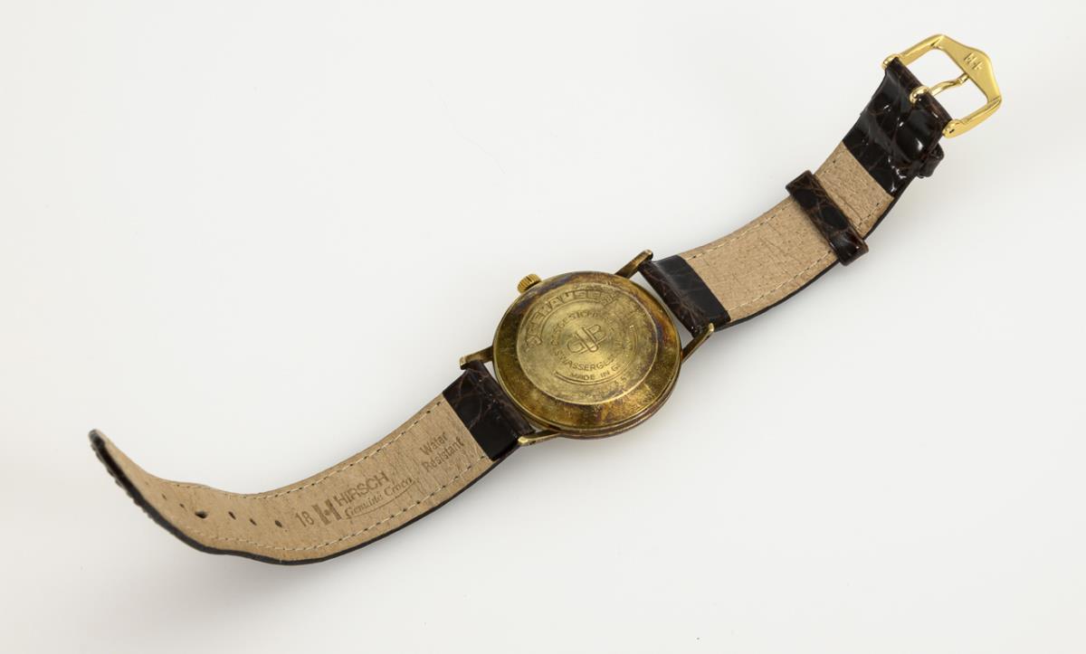 Automatic movement with anchor escapement and 26 jewels, setting crown. Functional in short time test. Silver-plated dial with hour indices, central second and baton hands.