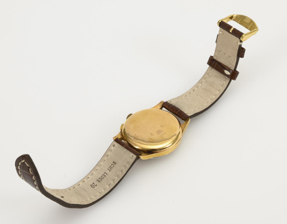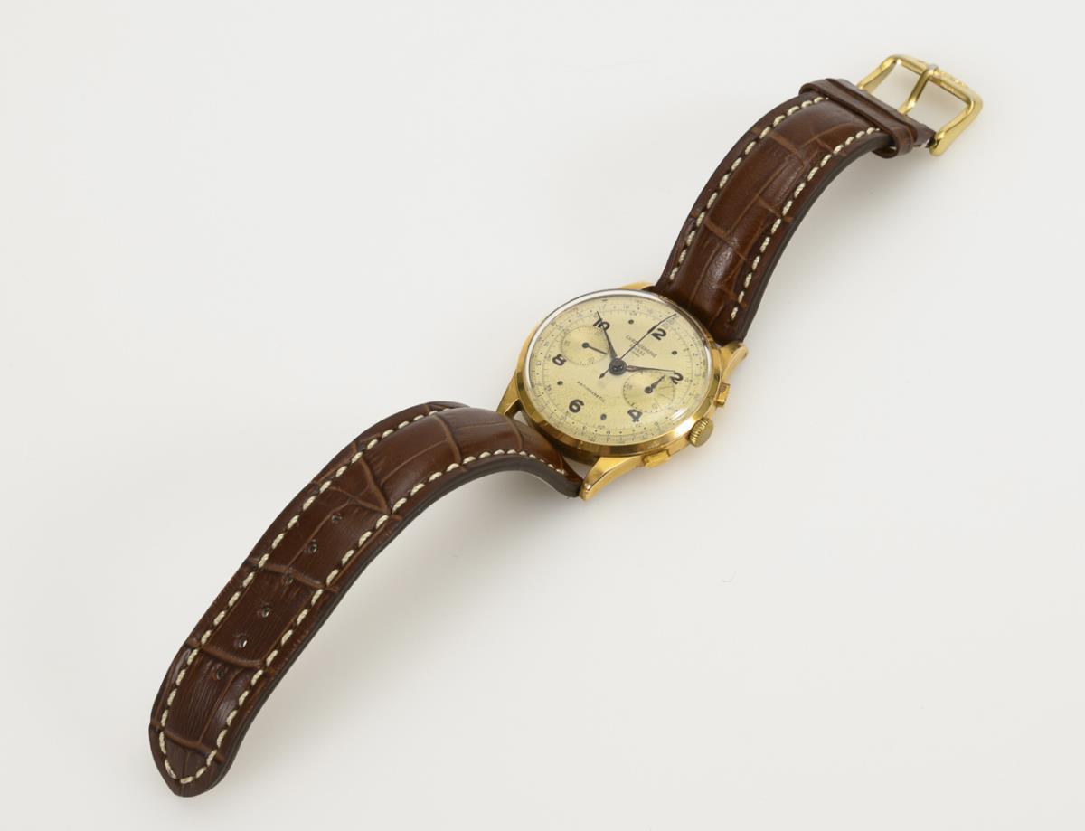 Spring movement with crown winding, 2 pushers for stop function. Functional in short time test. Silver-plated dial with several scales, Arabic numerals, subsidiary dials for small second and 30-minute display, dauphine hands and stop hands.
