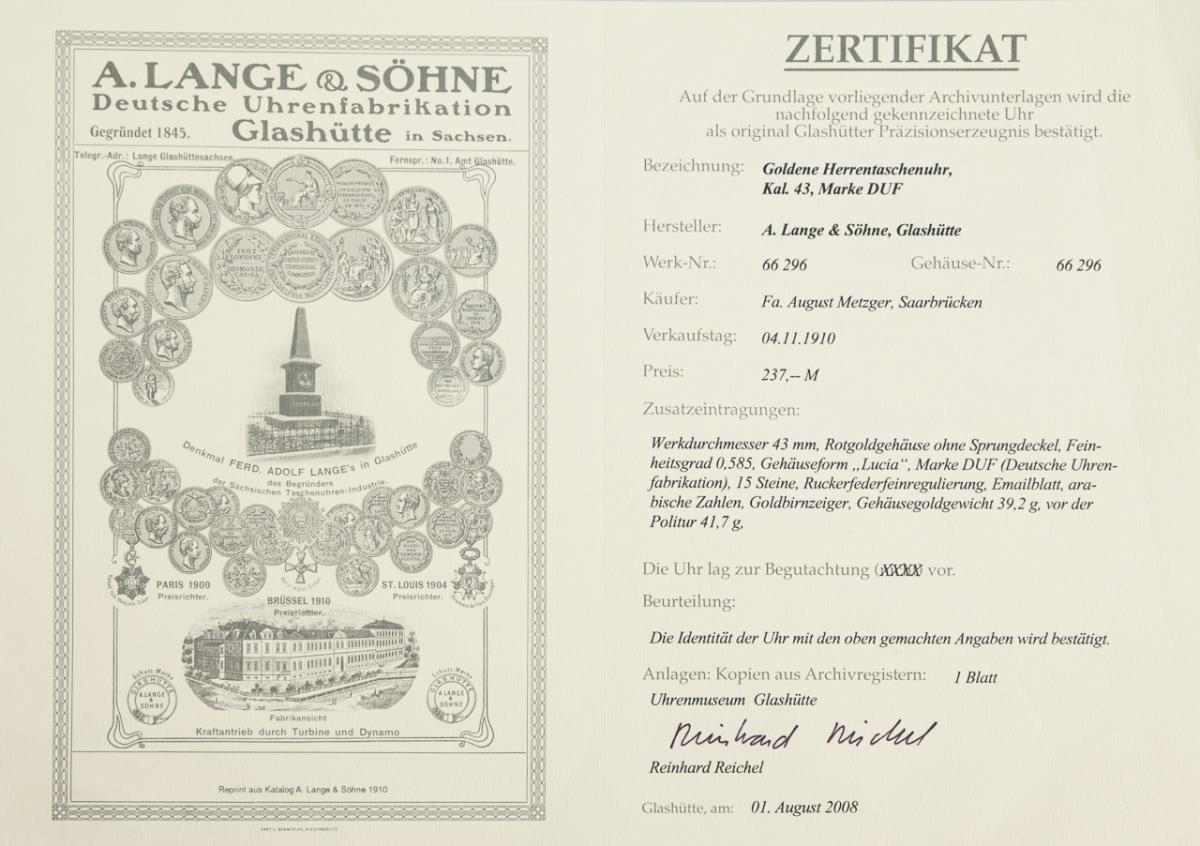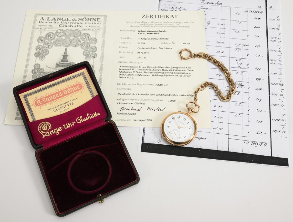 With Lange watch Glashütte case, certificate from the Glashütte watch museum dated August 11, 2008 and copy from the November 1910 sales book.