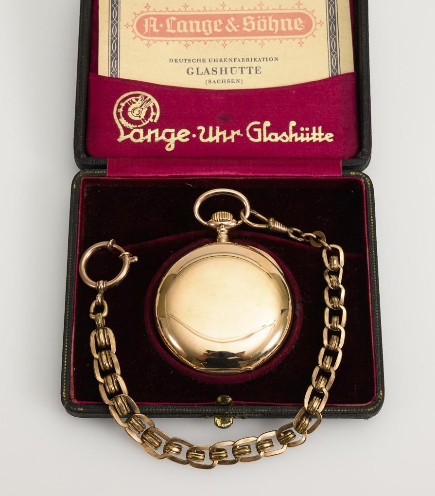 Gold pocket watch with watch chain in original case. Mark DUF / A. LANGE & SÖHNE, Glashütte.