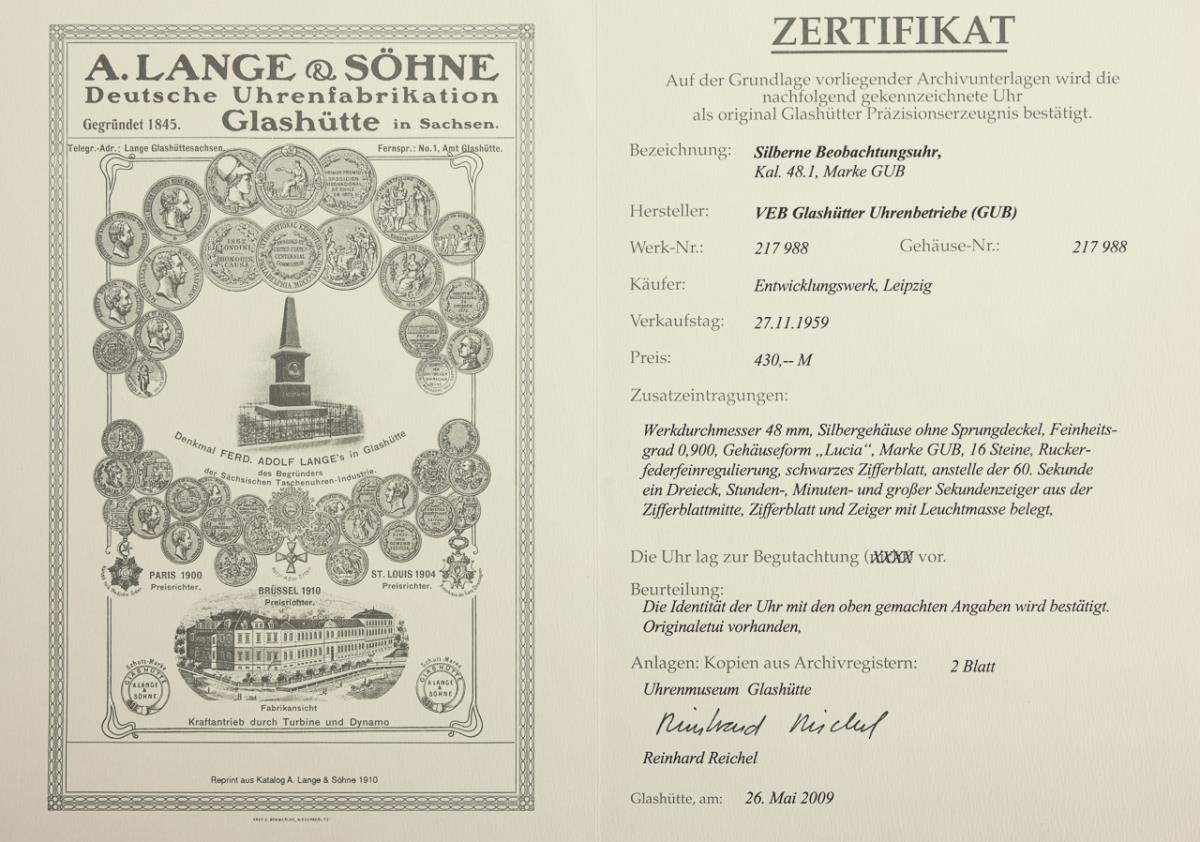 With red GUB case, certificate from the Glashütte watch museum dated May 26, 2009 and 2 copies from the sales book.