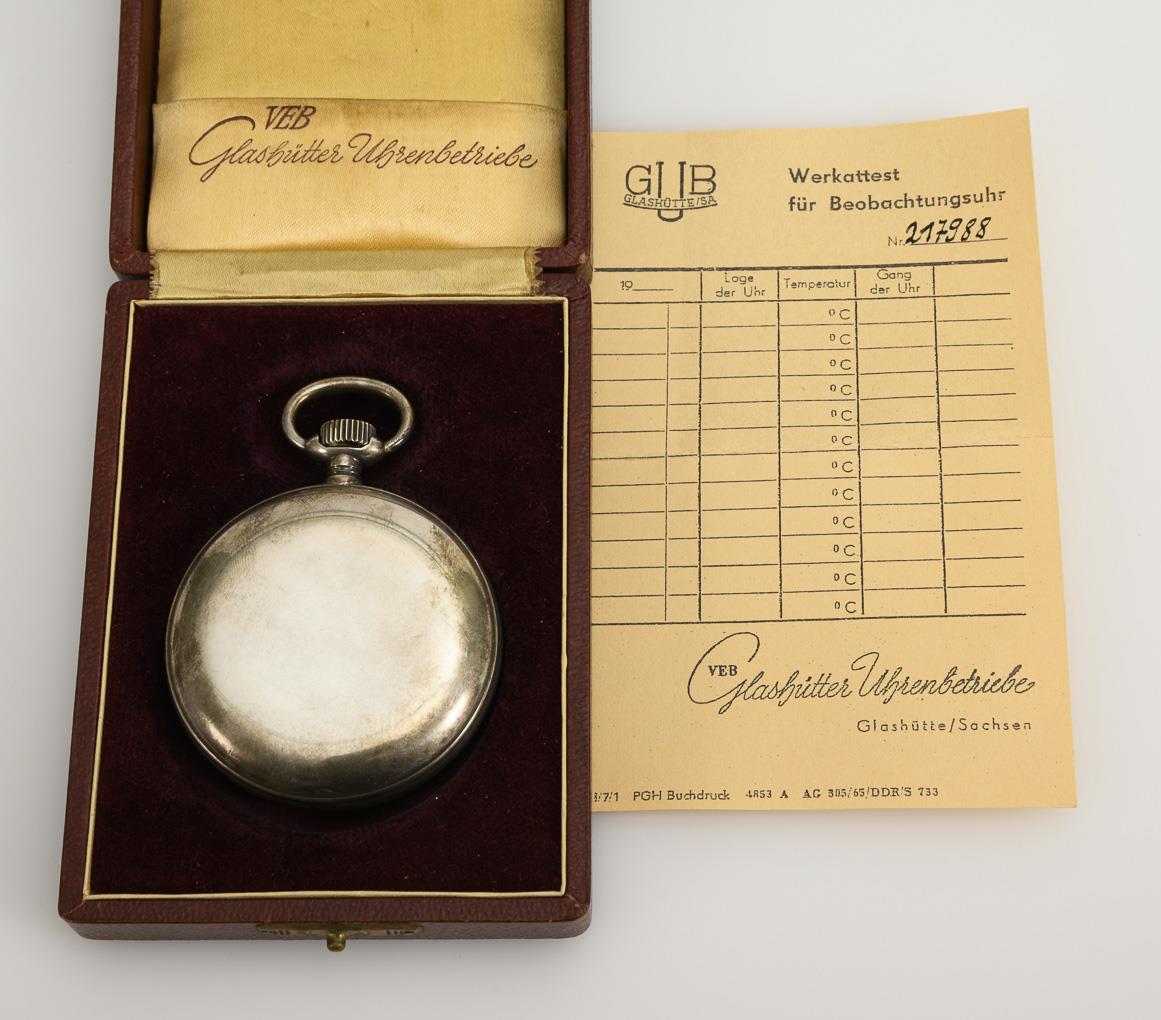 Silver observation watch in case. Mark GUB / VEB MECHANIK GLASHÜTTER UHRENBETRIEBE.