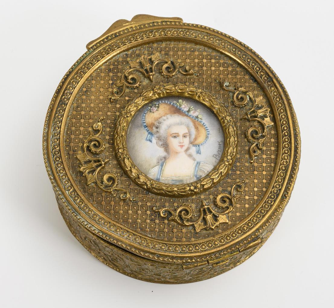 "Bornel" inscribed miniature under glazing on the hinged lid of the round box with fine relief ornament / Gilt box in baroque curved form with fine "engraving". Minimally dented.