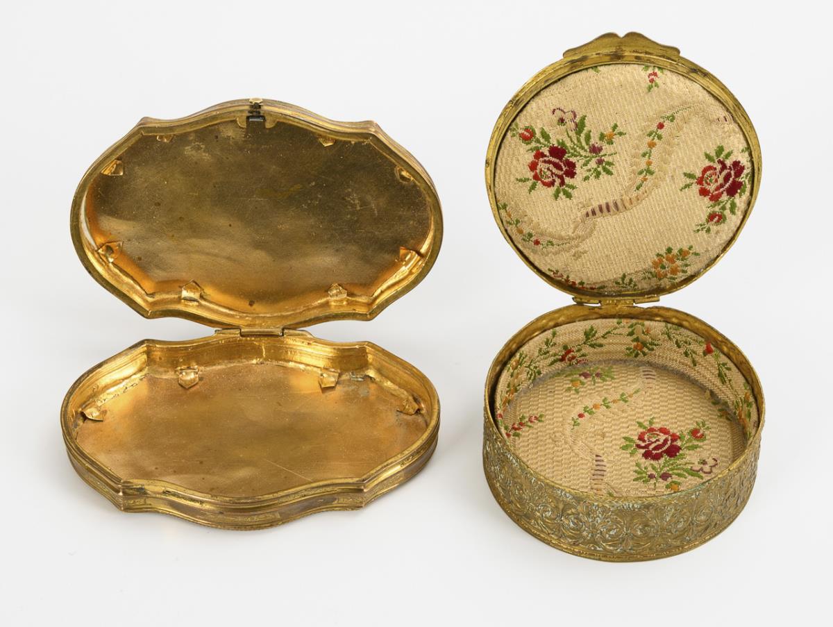 Rolled sheet brass or cast brass, 1x gilded, 1x lined with fabric, gouache. H 2.5 cm, Ø 7 cm and 2.5 x 9.5 x 6 cm respectively.