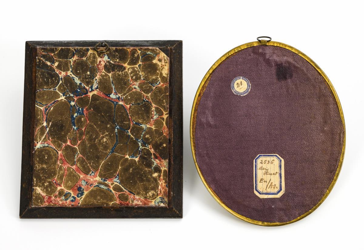 Finely painted Biedermeier lady in a blue dress with elaborate hairstyle. Glazed brass strip in union case frame. / Verso titled portrait of Mary Stuart in a glazed brass frame. Minimal paint chips to the Biedermeier portrait.