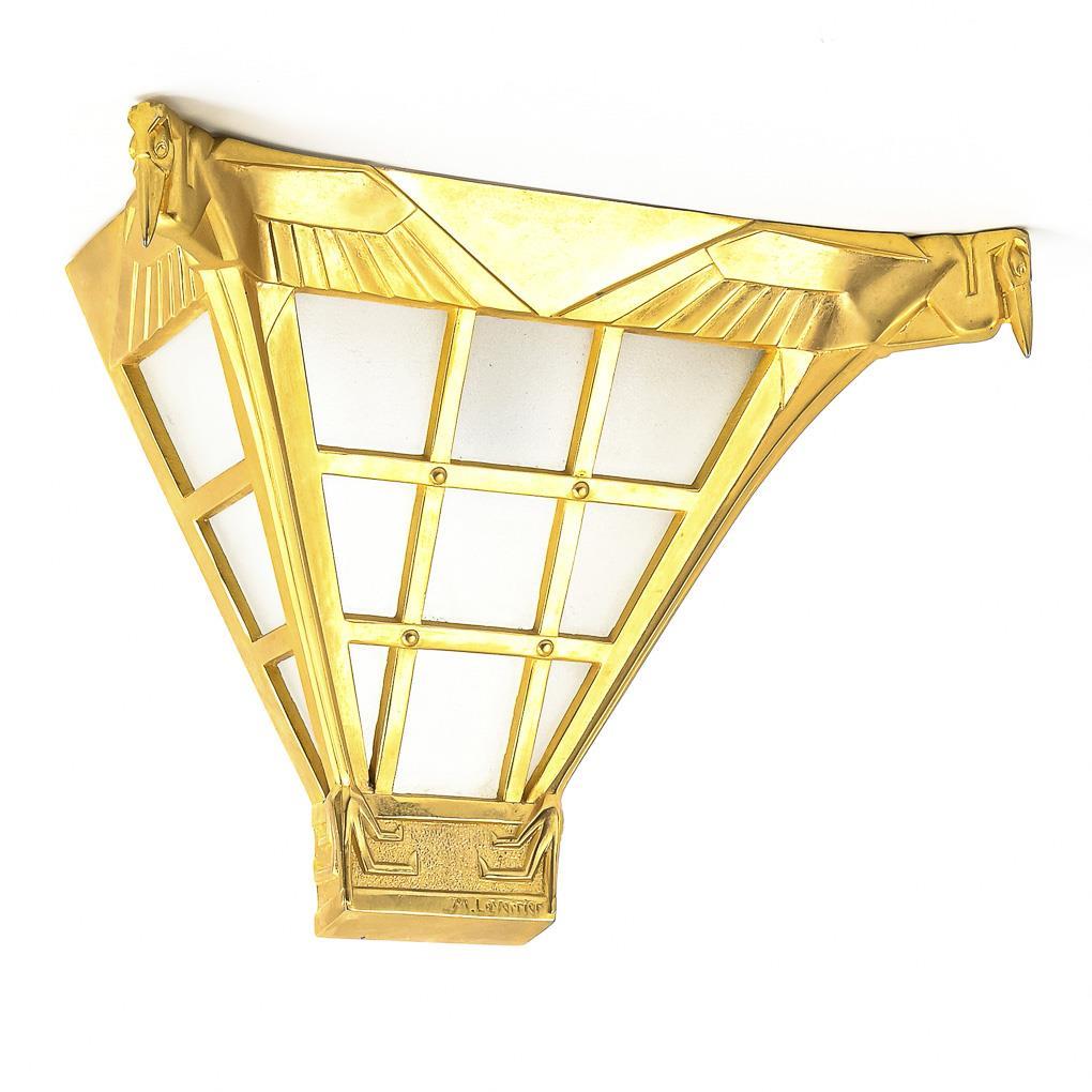 Cast metal, probably more recently gilded, frosted clear glass, screw mount. 23 x 33 x 16 cm. 3.5 kg.